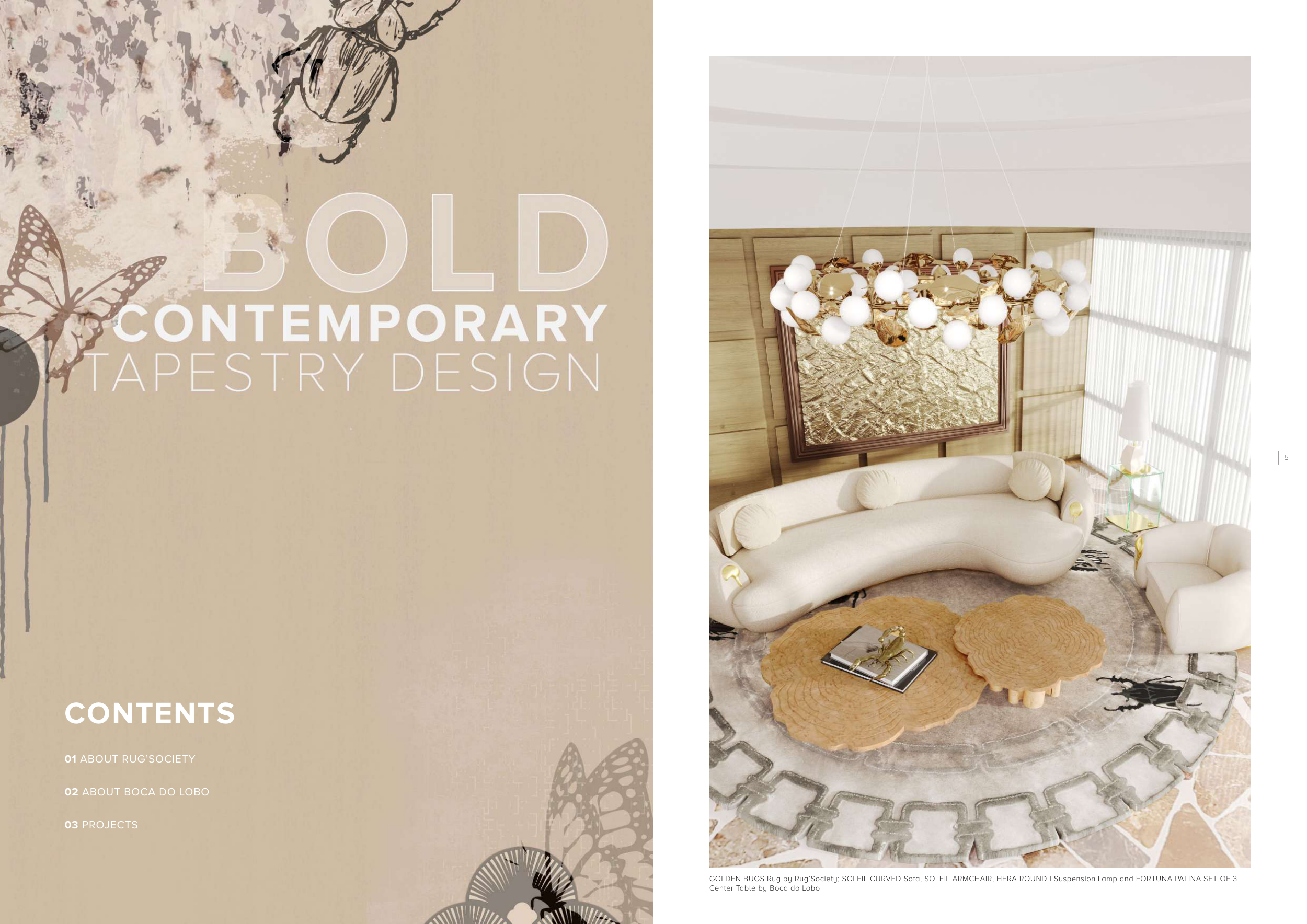 GOLDEN BUGS Rug by Rug’Society; SOLEIL CURVED Sofa, SOLEIL ARMCHAIR, HERA ROUND I Suspension Lamp and FORTUNA PATINA SET OF 3