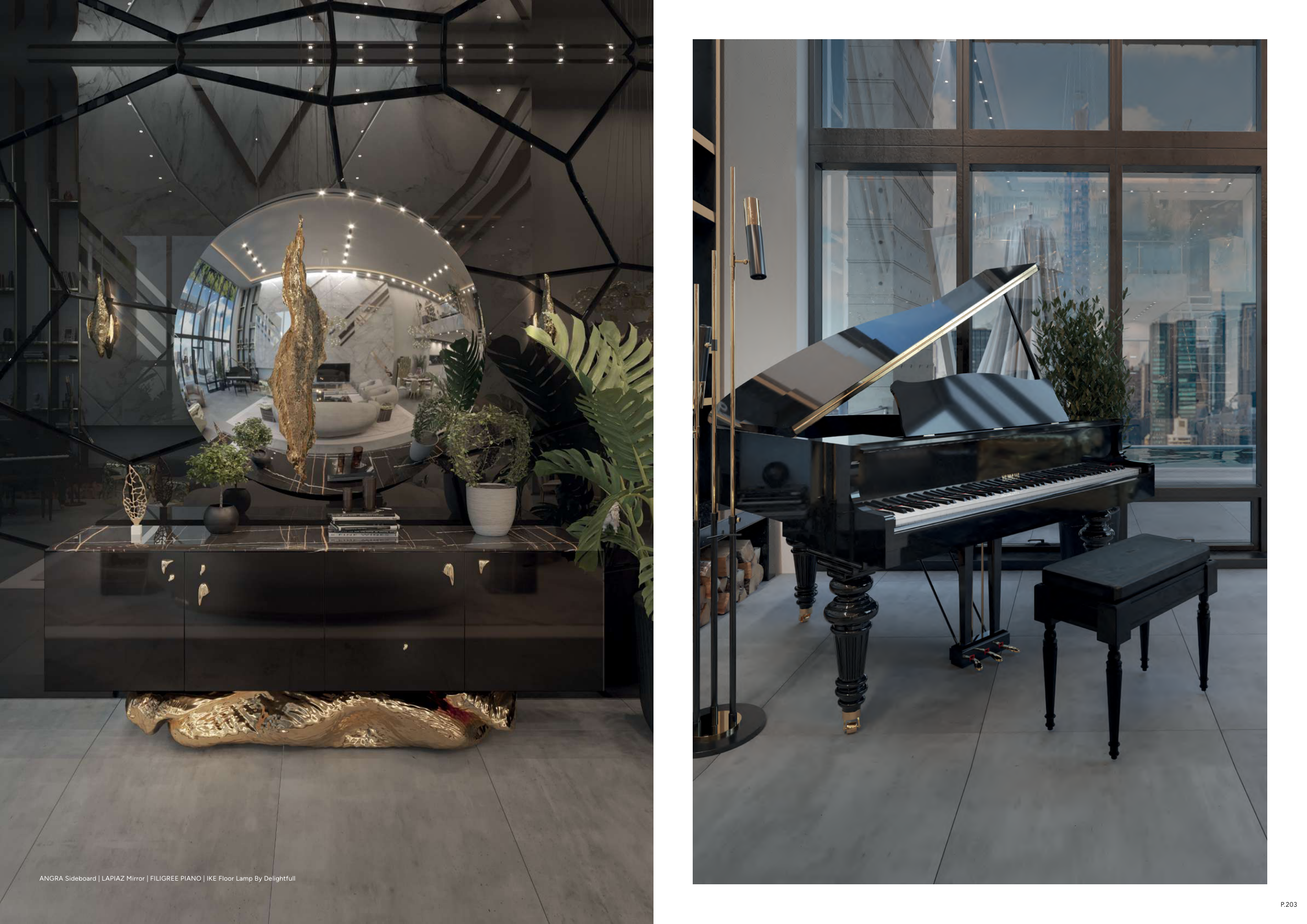 ANGRA Sideboard | LAPIAZ Mirror | FILIGREE PIANO | IKE Floor Lamp By Delightfull