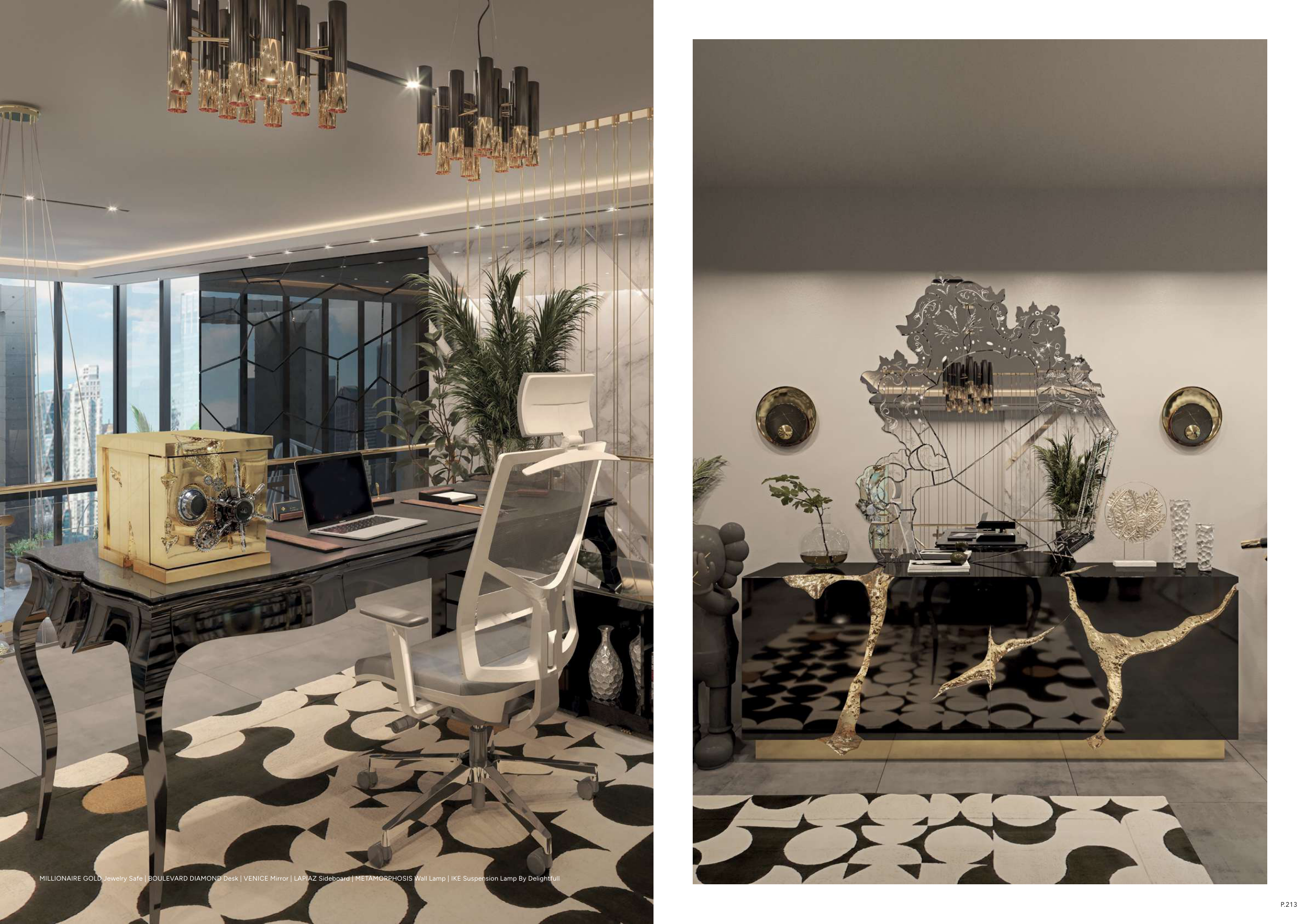 MILLIONAIRE GOLD Jewelry Safe | BOULEVARD DIAMOND Desk | VENICE Mirror | LAPIAZ Sideboard | METAMORPHOSIS Wall Lamp | IKE Suspension Lamp By Delightfull
