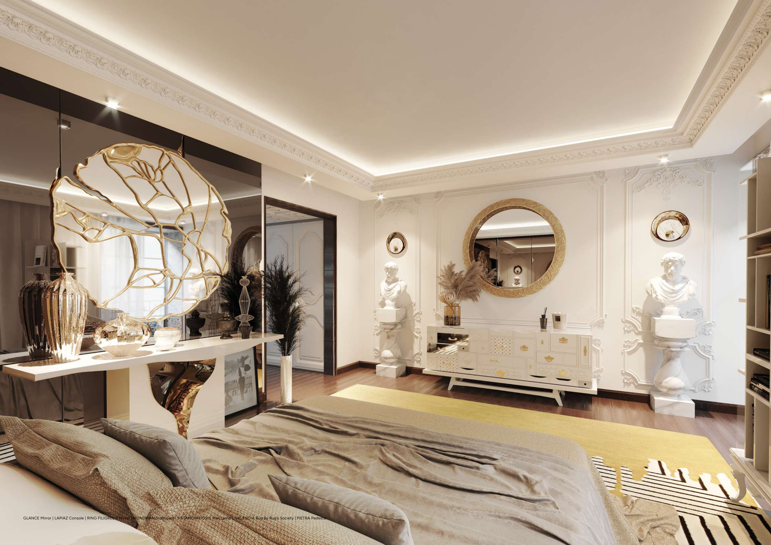 GLANCE Mirror | LAPIAZ Console | RING FILIGREE II Mirror | MONDRIAN Sideboard | METAMORPHOSIS Wall Lamp | VALENCIA Rug By Rug’s Society | PIETRA Pedestal