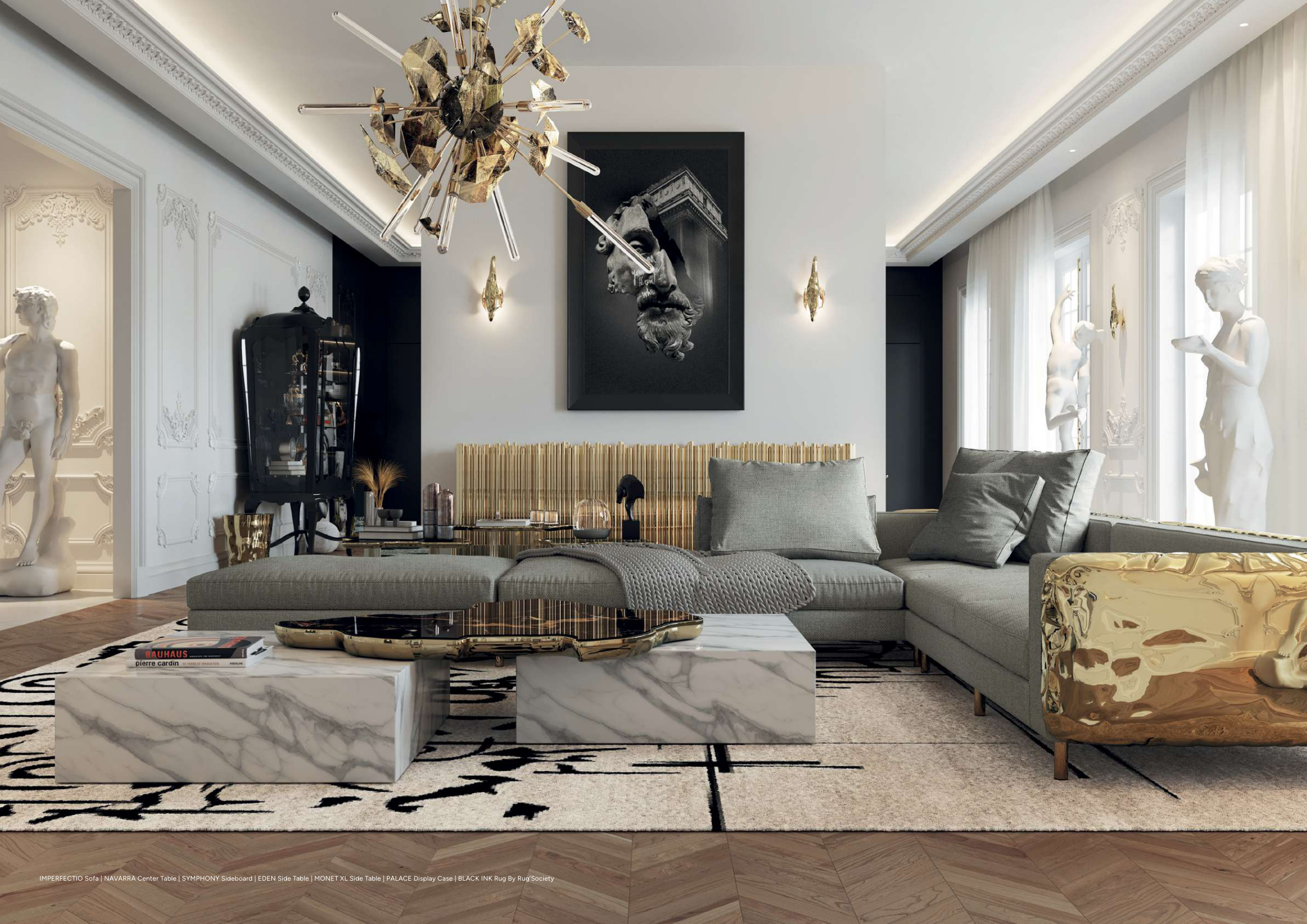 IMPERFECTIO Sofa | NAVARRA Center Table | SYMPHONY Sideboard | EDEN Side Table | MONET XL Side Table | PALACE Display Case | BLACK INK Rug By Rug’Society