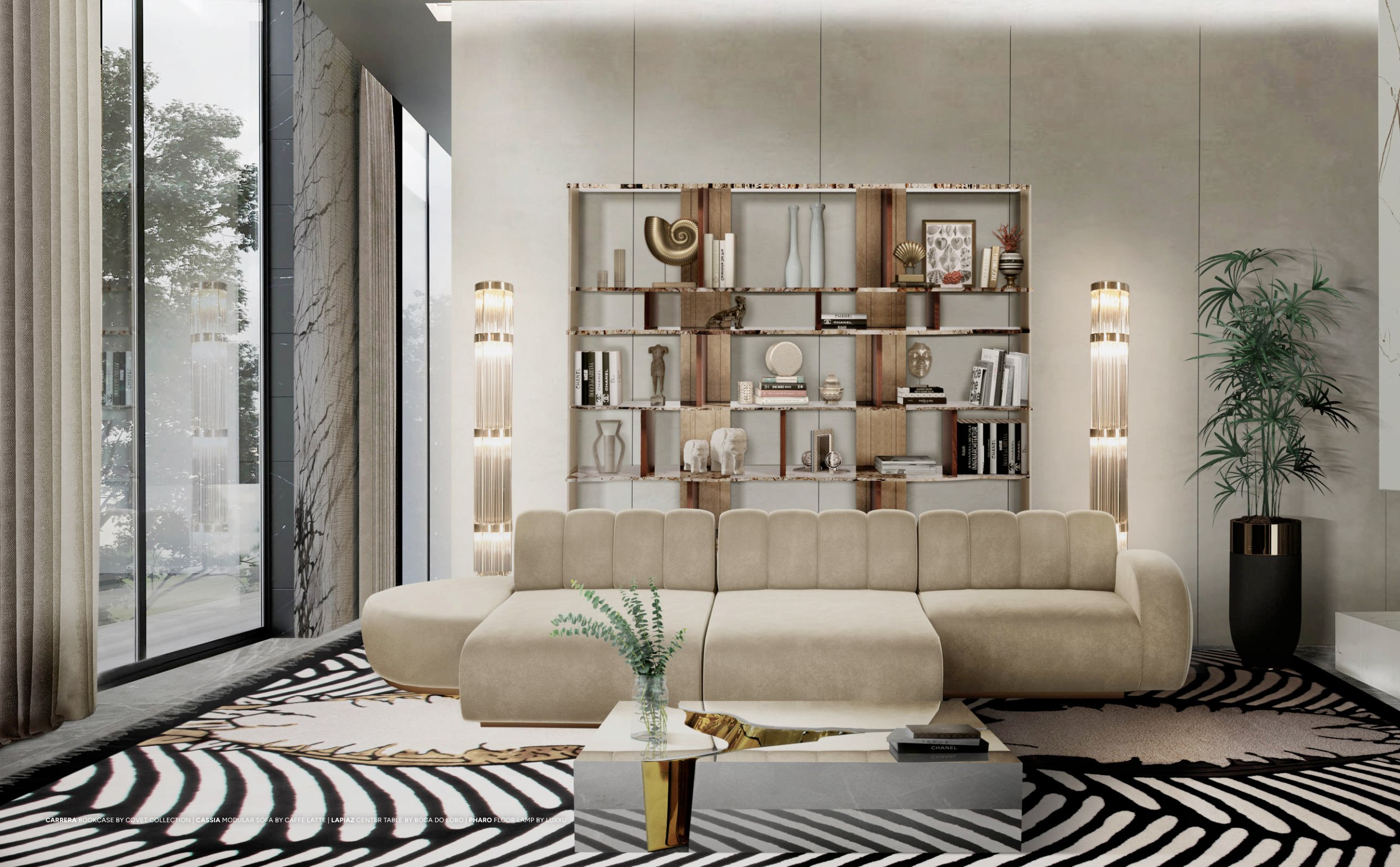 CARRERA BOOKCASE BY COVET COLLECTION | CASSIA MODULAR SOFA BY CAFFE LATTE | LAPIAZ CENTER TABLE BY BOCA DO LOBO | PHARO FLOOR LAMP BY LUXXU
