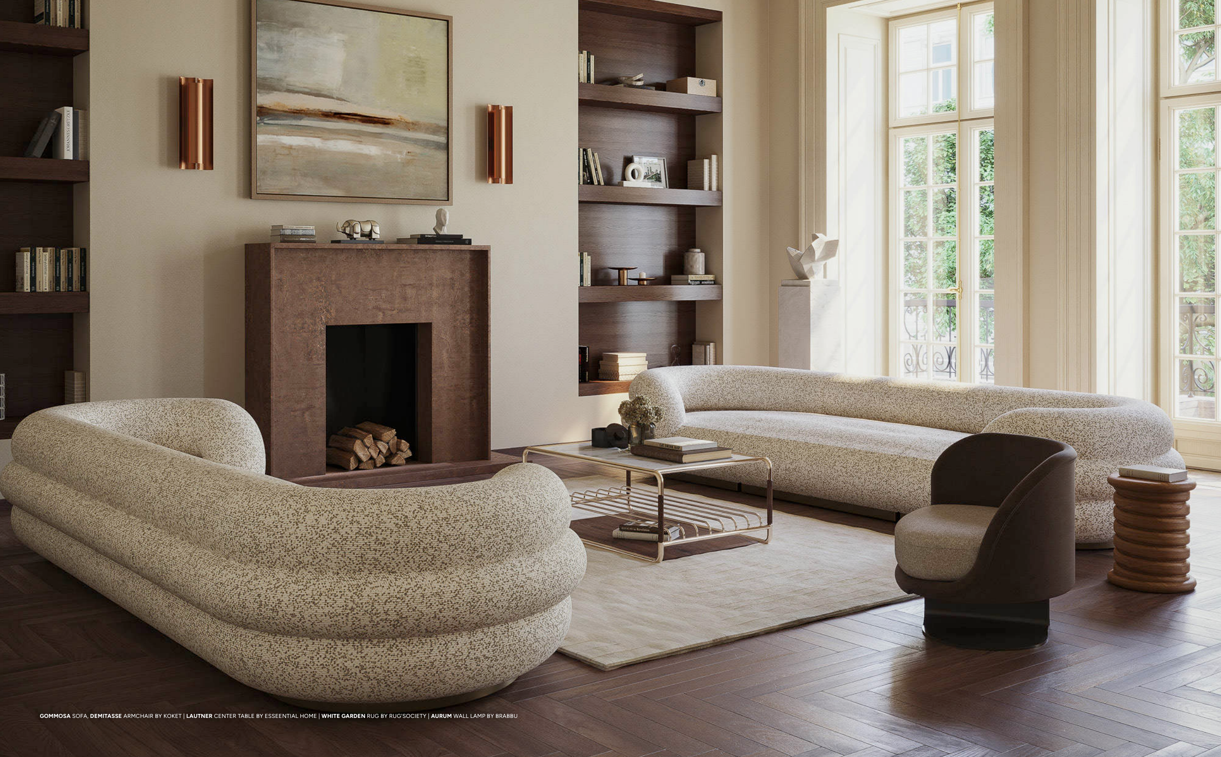 GOMMOSA SOFA, DEMITASSE ARMCHAIR BY KOKET | LAUTNER CENTER TABLE BY ESSEENTIAL HOME | WHITE GARDEN RUG BY RUG'SOCIETY | AURUM WALL LAMP BY BRABBU