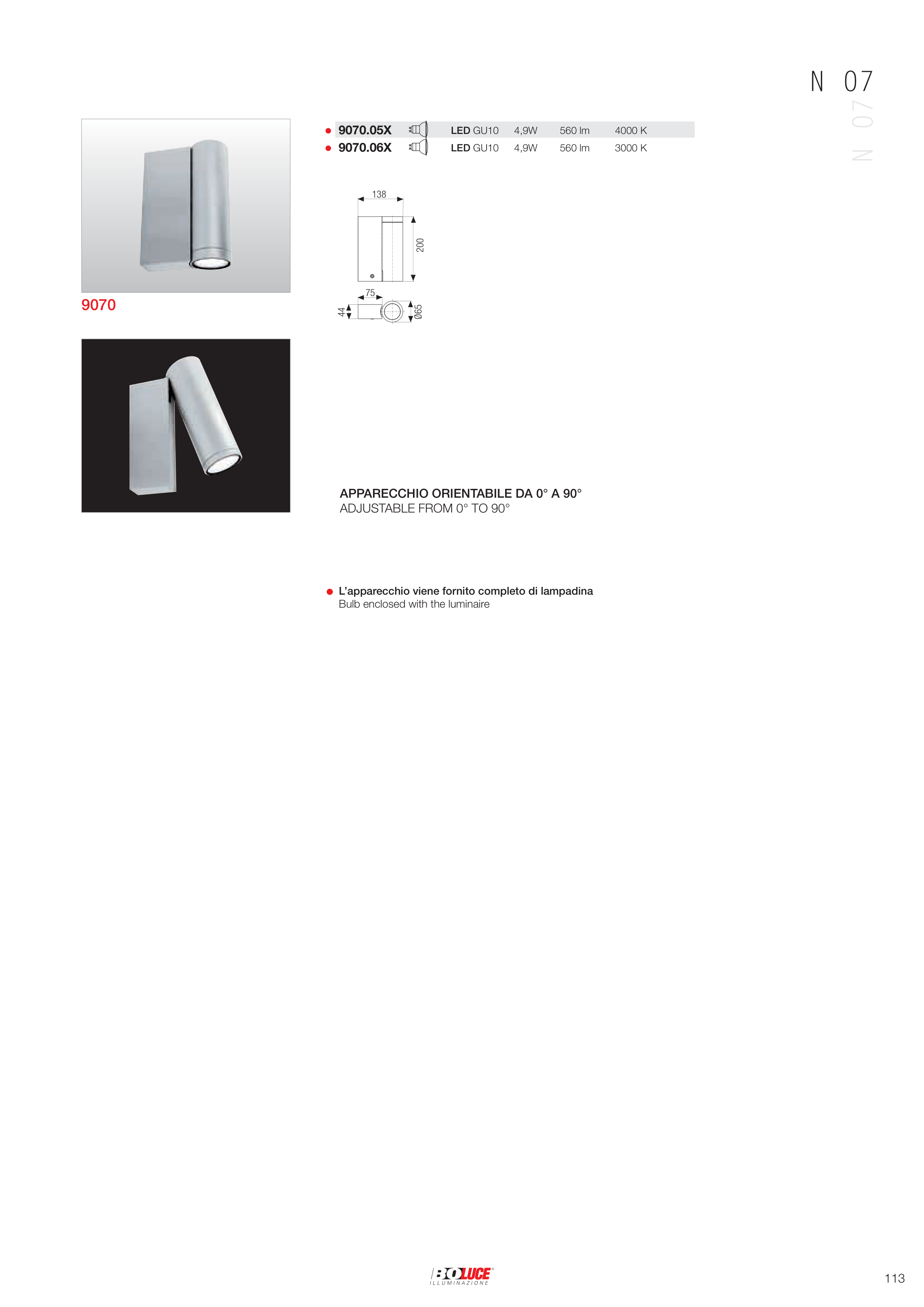 113 9070 138 75 Ø65 44 200 9070.05X 4,9W 560 lm 4000 K LED GU10 9070.06X 4,9W 560 lm 3000 K LED GU10 N 07 N 07 APPARECCHIO ORIENTABILE DA 0° A 90° ADJUSTABLE FROM 0° TO 90° L’apparecchio viene fornito completo di lampadina Bulb enclosed with the luminaire