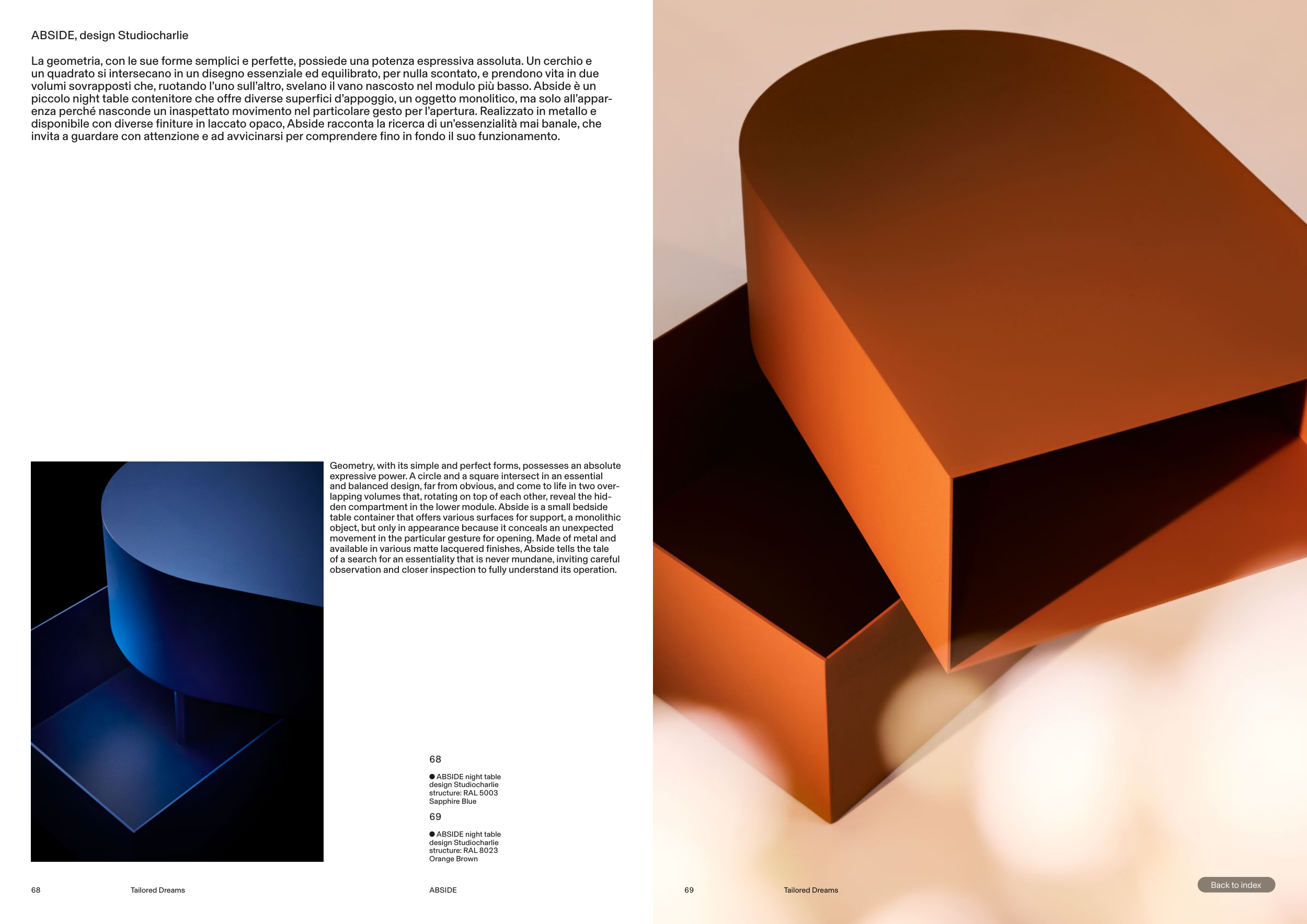 available in various matte lacquered finishes, Abside tells the tale