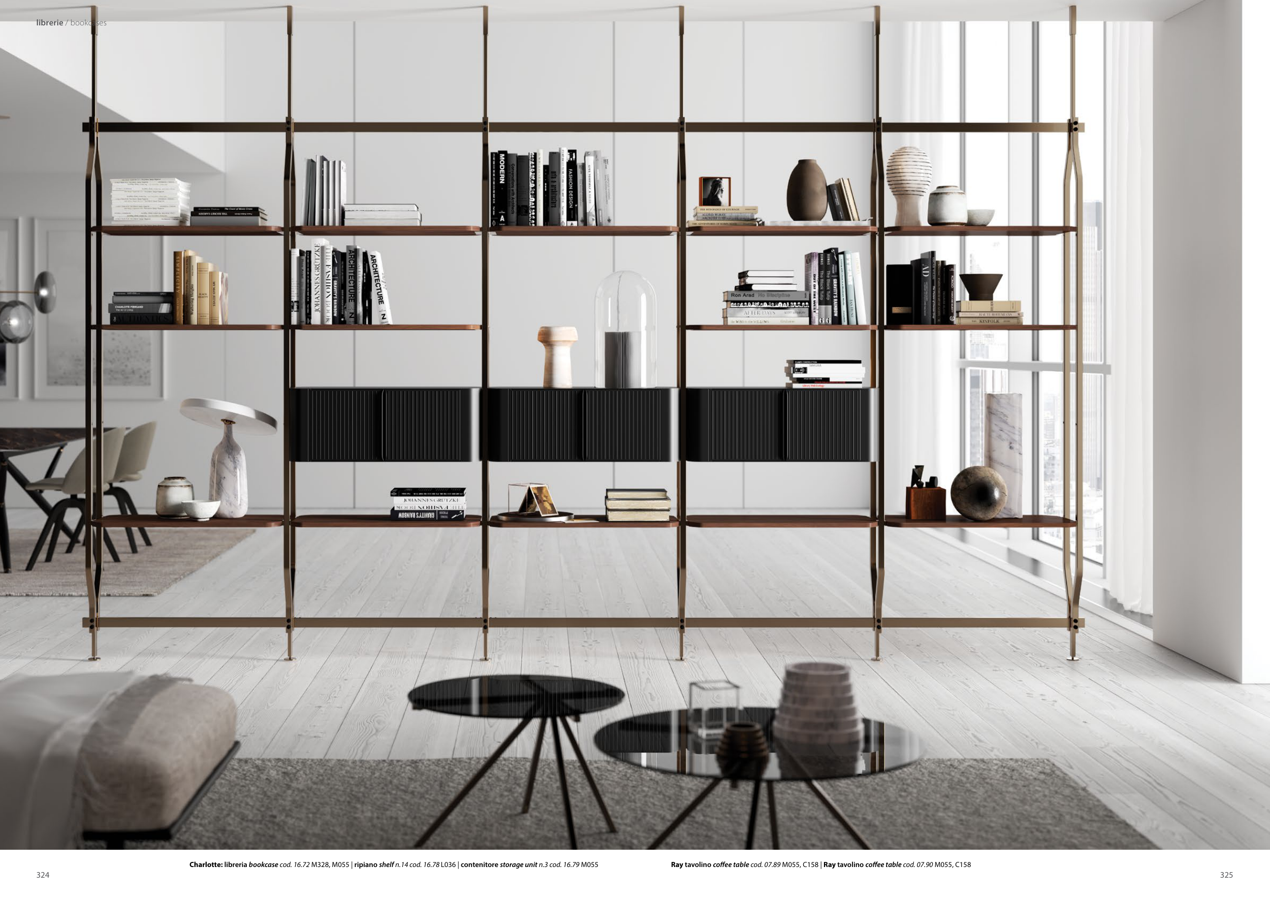 Charlotte: libreria bookcase cod. 16.72 M328, M055 | ripiano shelf n.14 cod. 16.78 L036 | contenitore storage unit n.3 cod. 16.79 M055