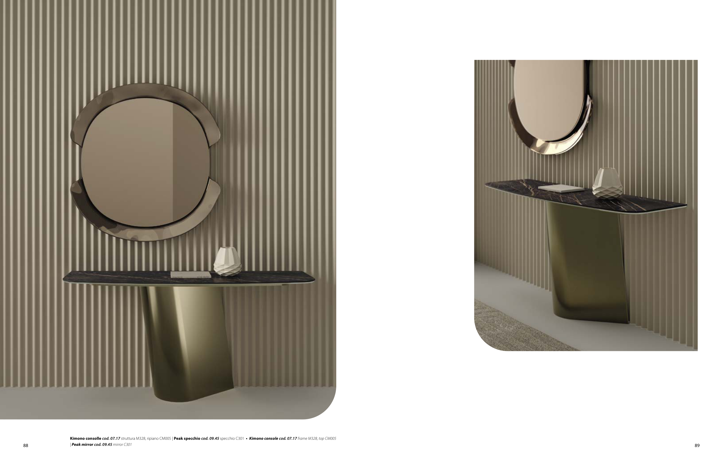 Kimono consolle cod. 07.17 struttura M328, ripiano CM005 | Peak specchio cod. 09.45 specchio C301 • Kimono console cod. 07.17 frame M328, top CM005