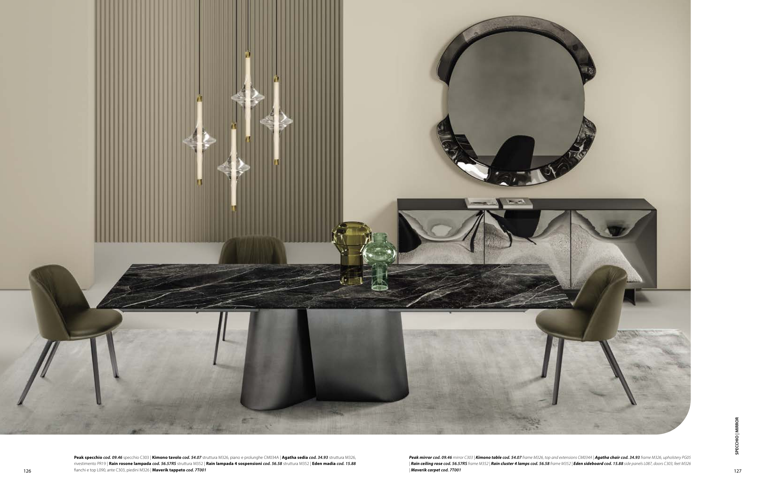Peak mirror cod. 09.46 mirror C303 | Kimono table cod. 54.07 frame M326, top and extensions CM034A | Agatha chair cod. 34.93 frame M326, upholstery PG05