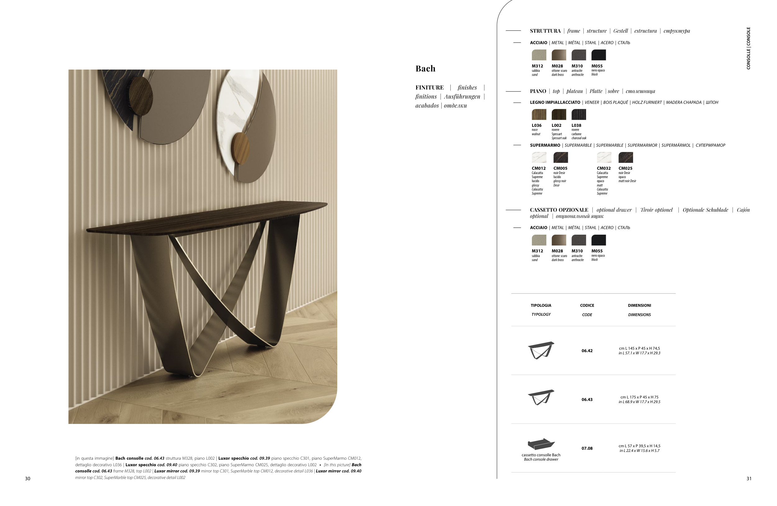 consolle cod. 06.43 frame M328, top L002 | Luxor mirror cod. 09.39 mirror top C301, SuperMarble top CM012, decorative detail L036 | Luxor mirror cod. 09.40
