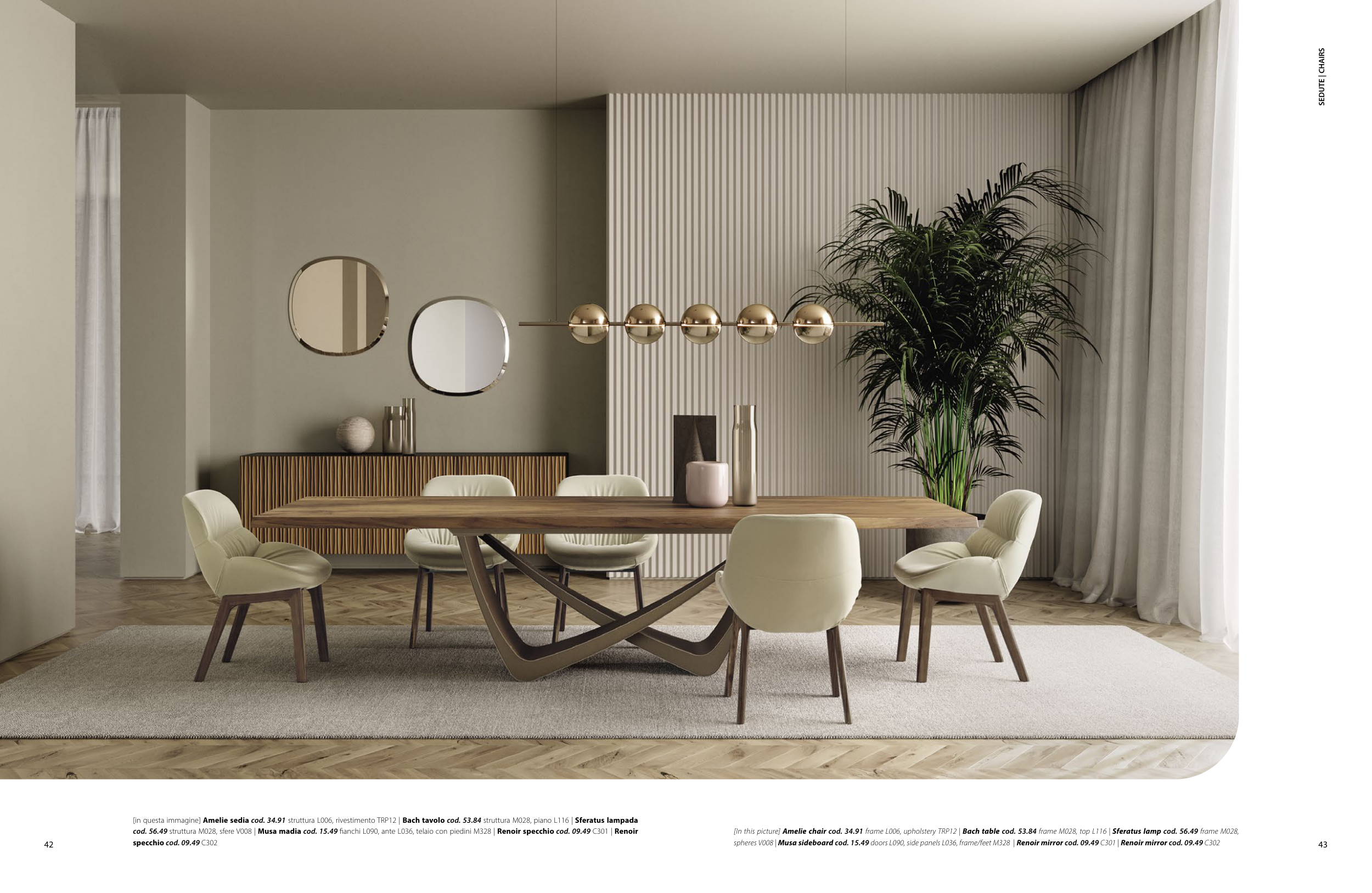 cod. 56.49 struttura M028, sfere V008 | Musa madia cod. 15.49 fianchi L090, ante L036, telaio con piedini M328 | Renoir specchio cod. 09.49 C301 | Renoir