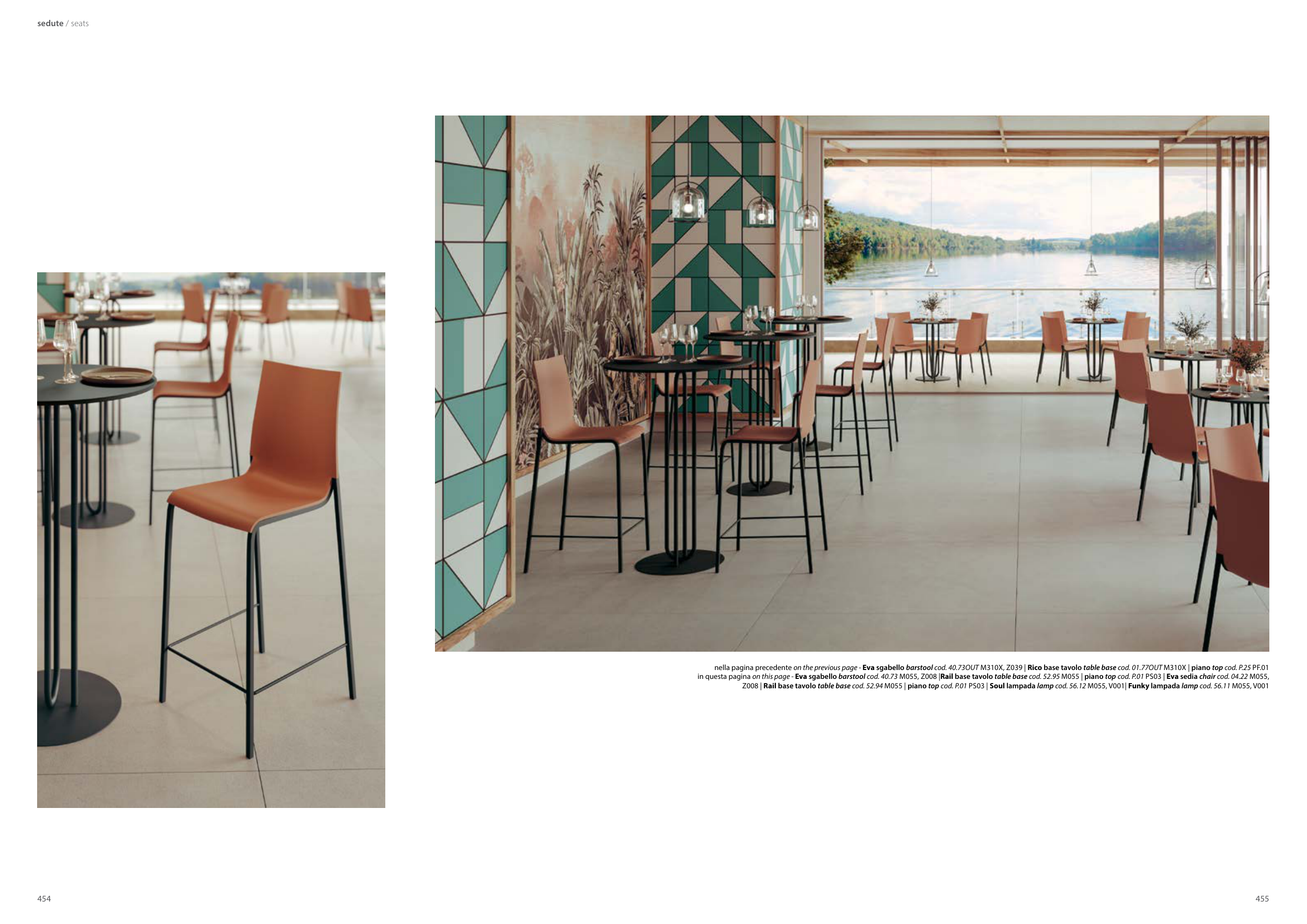 in questa pagina on this page - Eva sgabello barstool cod. 40.73 M055, Z008 |Rail base tavolo table base cod. 52.95 M055 | piano top cod. P.01 PS03 | Eva sedia chair cod. 04.22 M055,