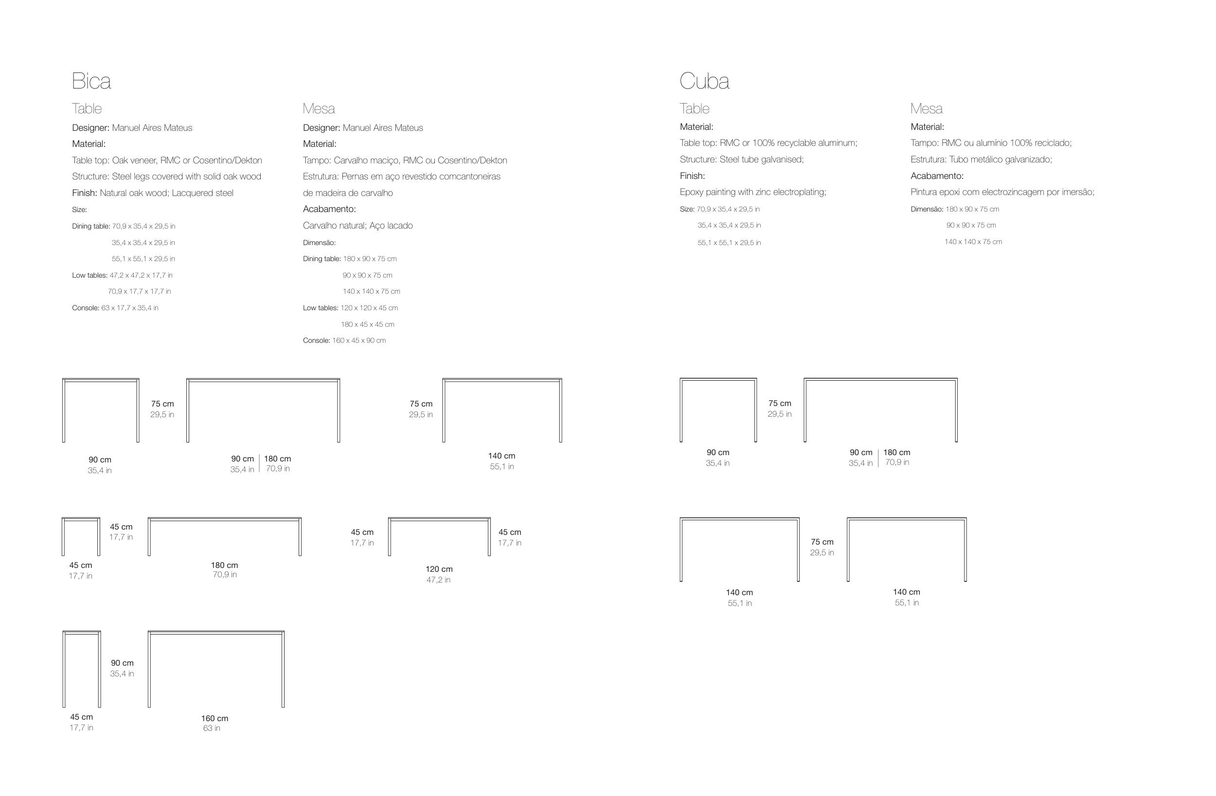 Tampo: Carvalho maciço, RMC ou Cosentino/Dekton