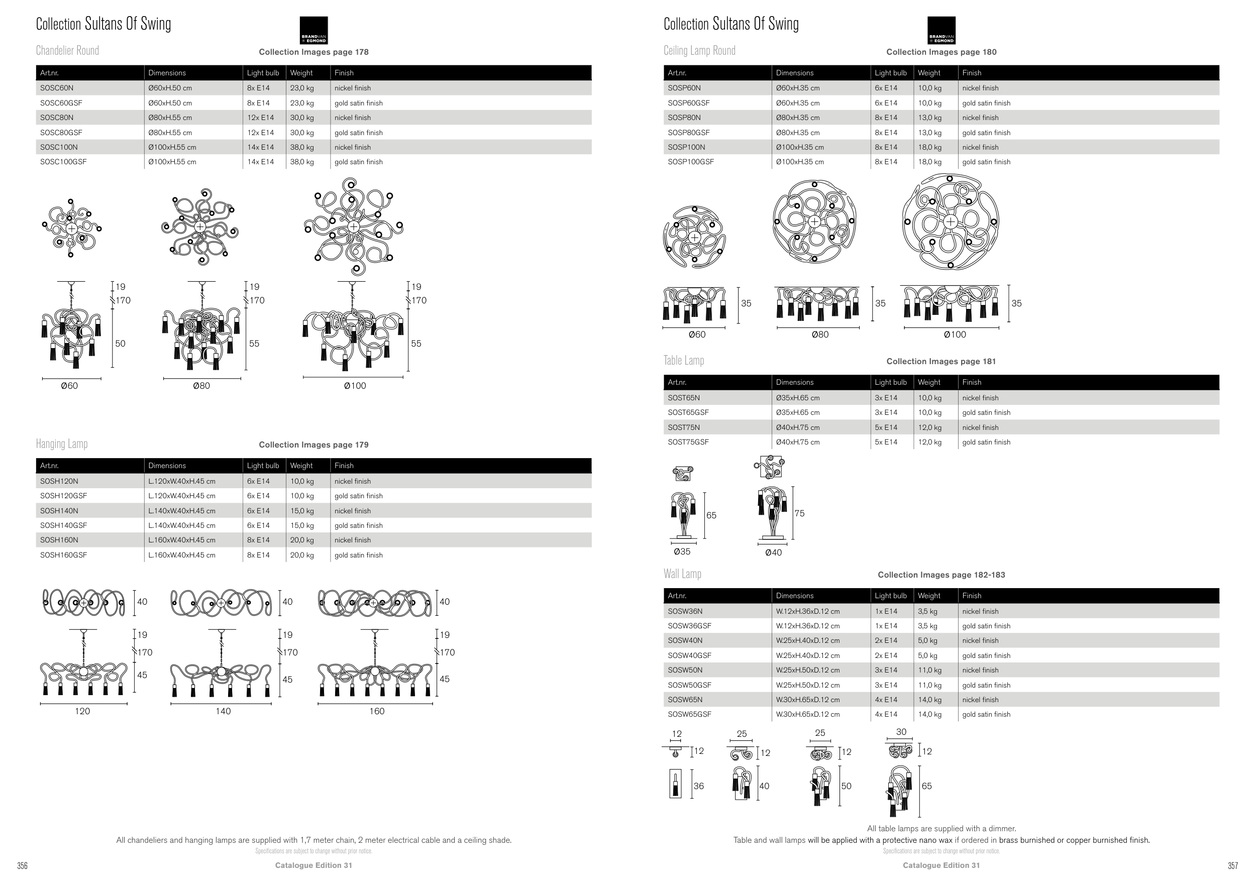 All chandeliers and hanging lamps are supplied with 1,7 meter chain, 2 meter electrical cable and a ceiling shade.