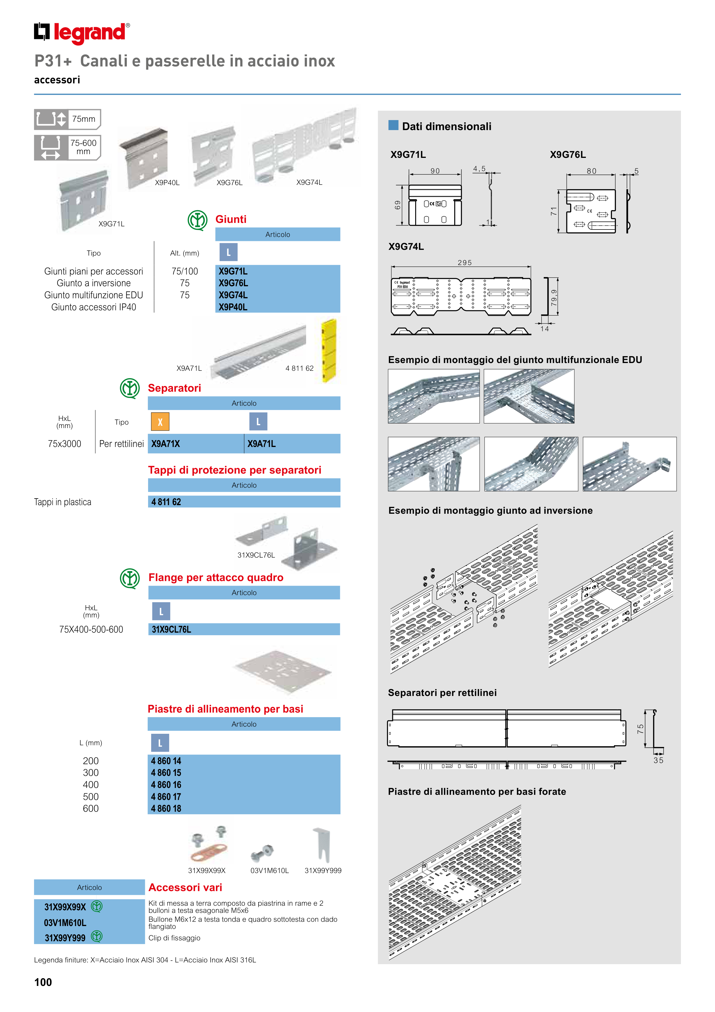 Legenda finiture: X=Acciaio Inox AISI 304 - L=Acciaio Inox AISI 316L