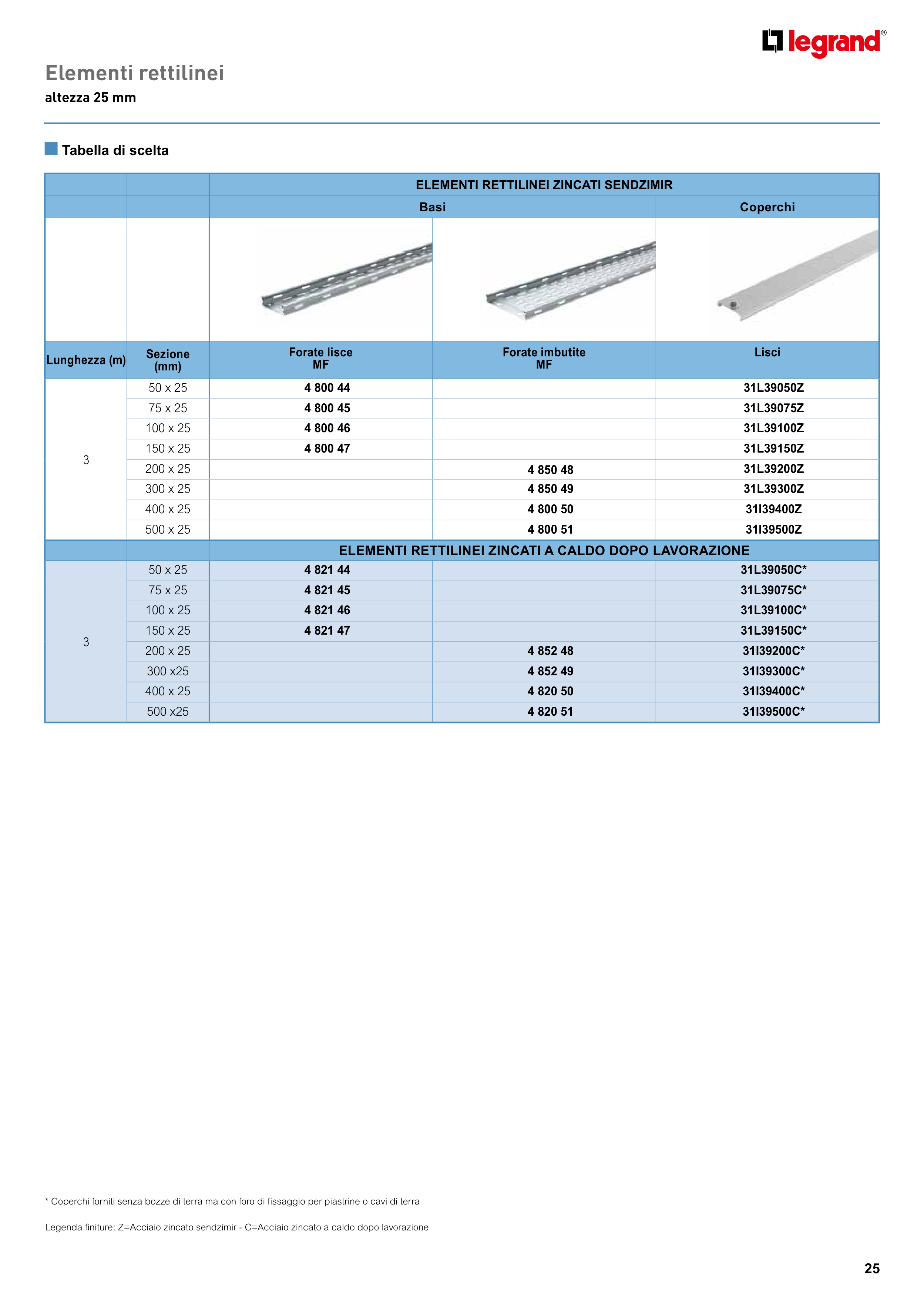 Legenda finiture: Z=Acciaio zincato sendzimir - C=Acciaio zincato a caldo dopo lavorazione