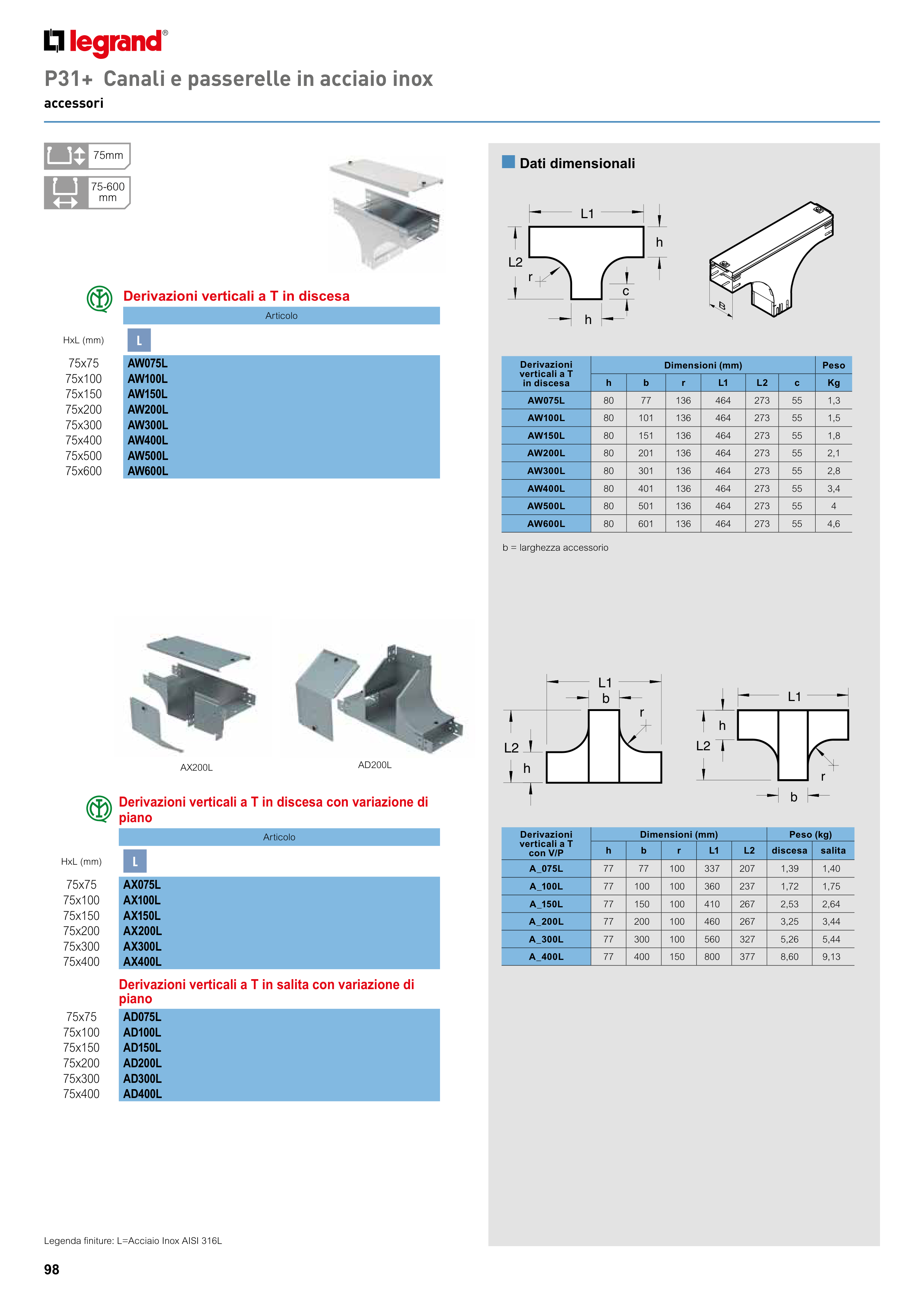 Legenda finiture: L=Acciaio Inox AISI 316L