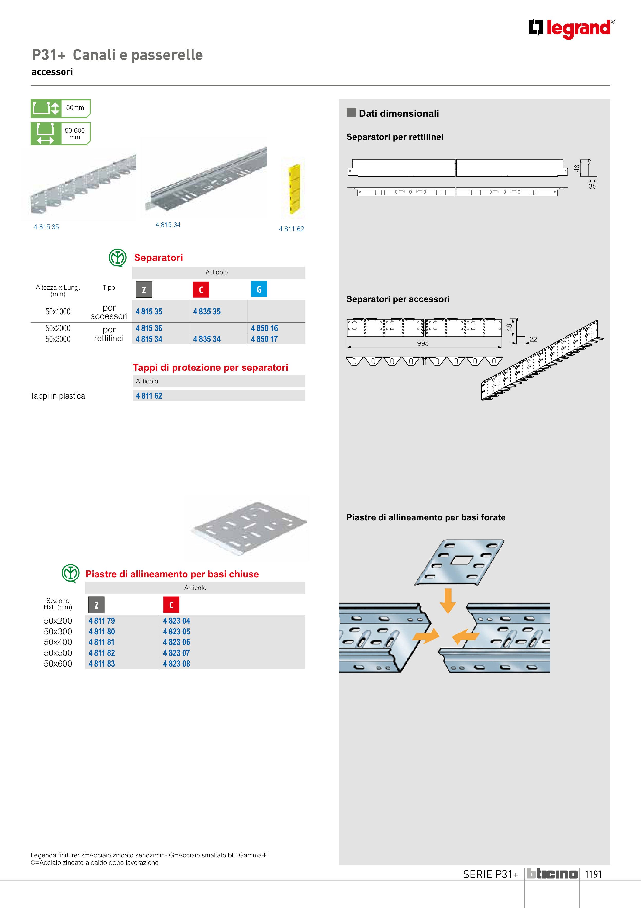 Legenda finiture: Z=Acciaio zincato sendzimir - G=Acciaio smaltato blu Gamma-P
