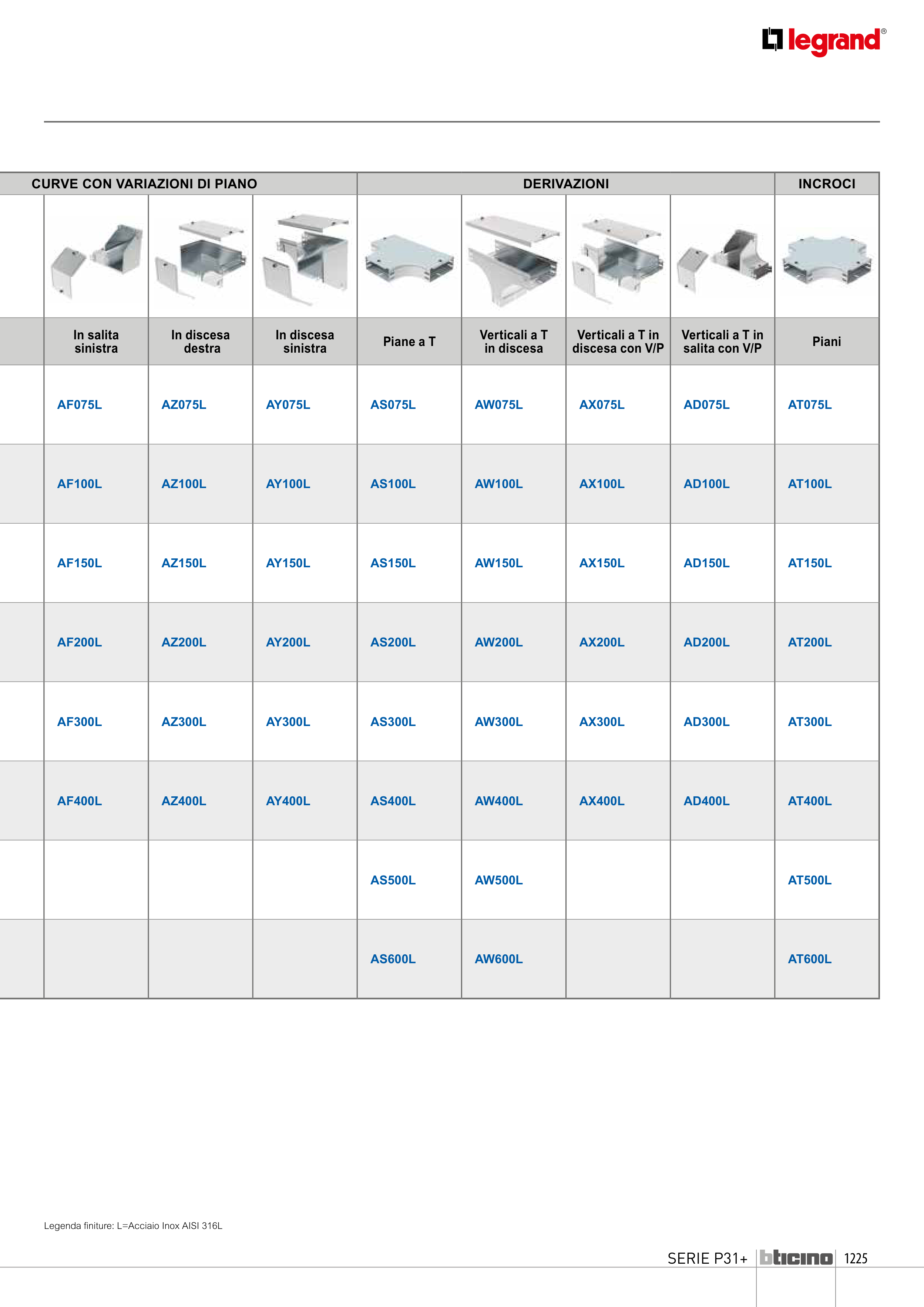 Legenda finiture: L=Acciaio Inox AISI 316L