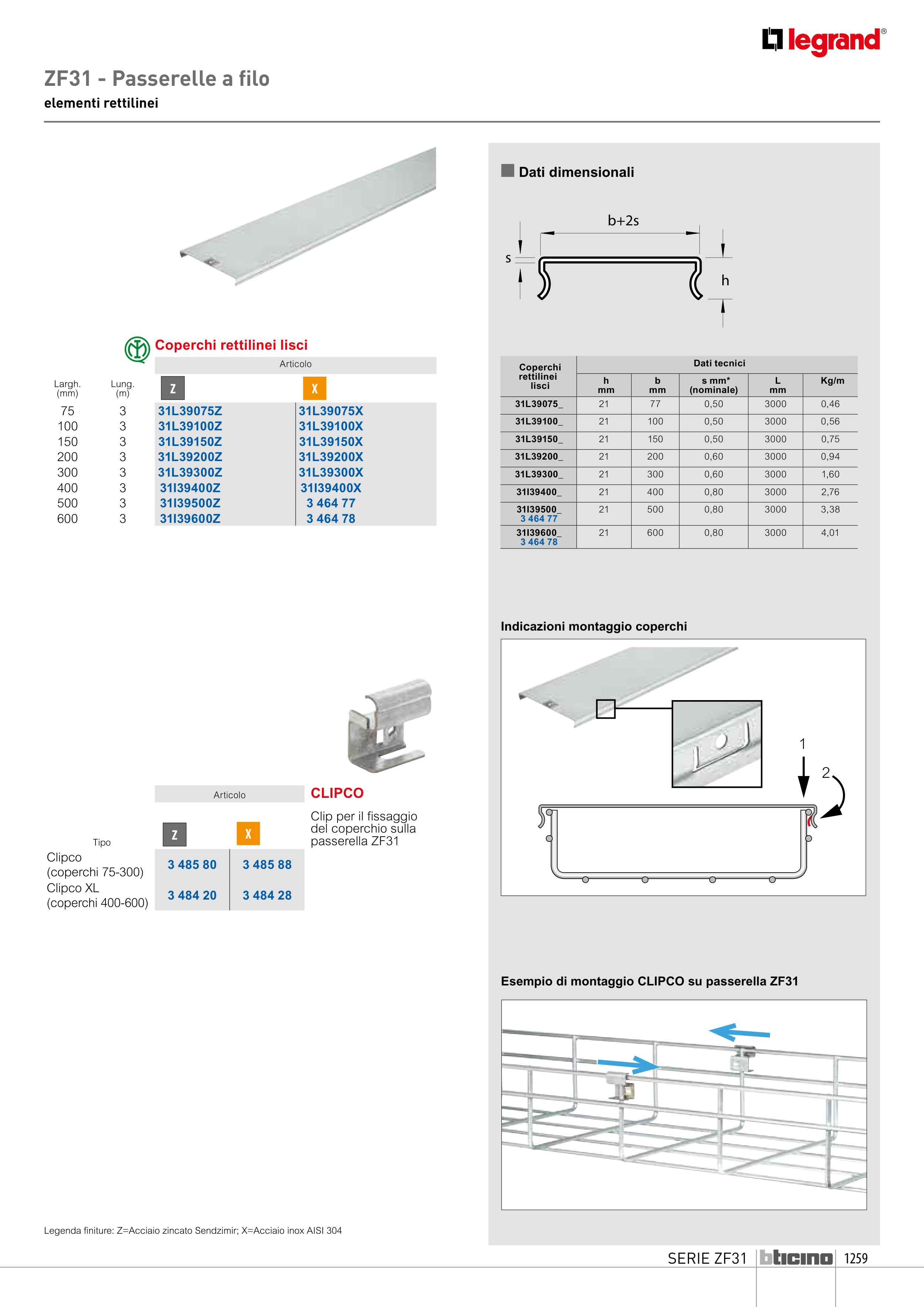 Legenda finiture: Z=Acciaio zincato Sendzimir; X=Acciaio inox AISI 304