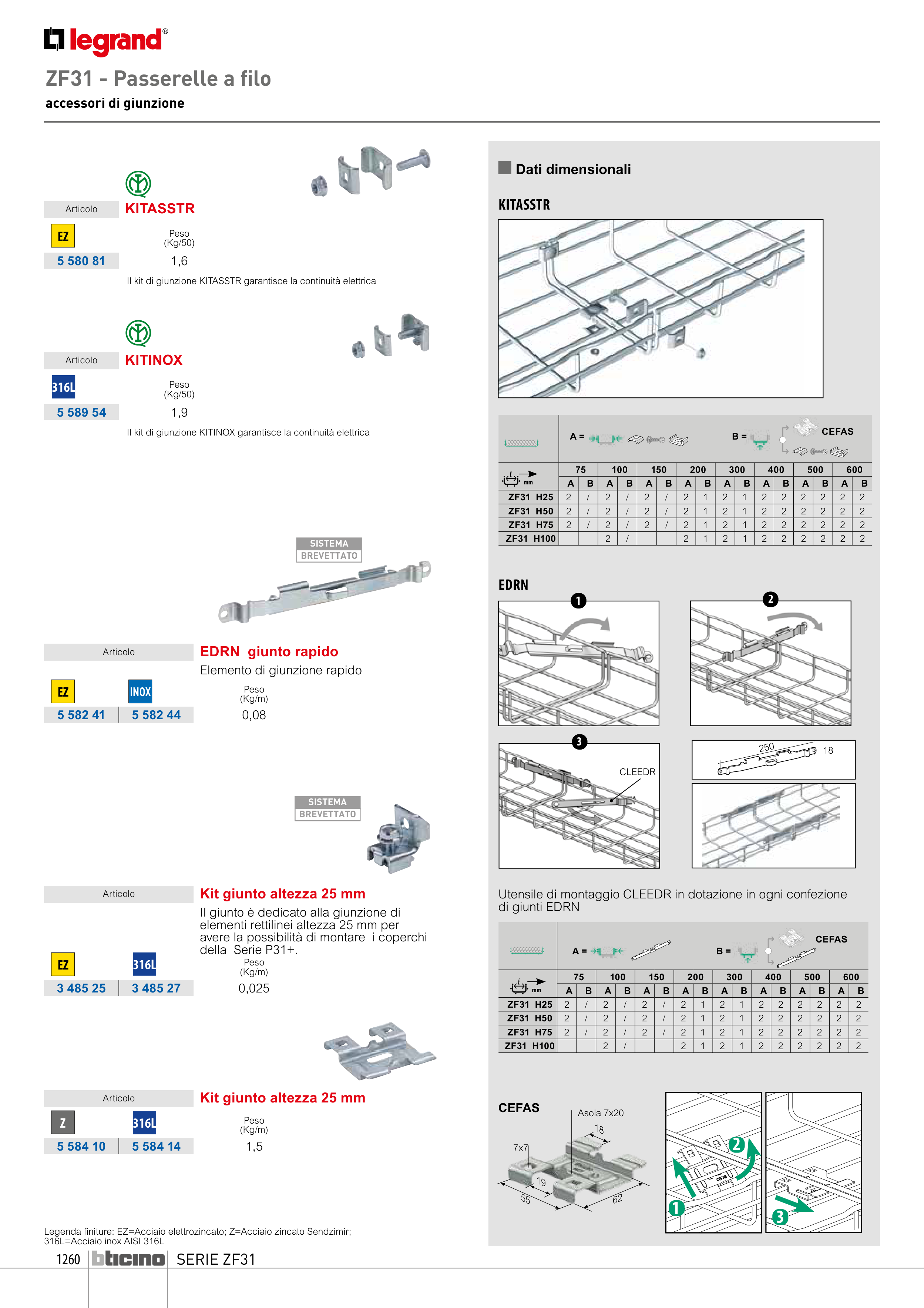 Legenda finiture: EZ=Acciaio elettrozincato; Z=Acciaio zincato Sendzimir;