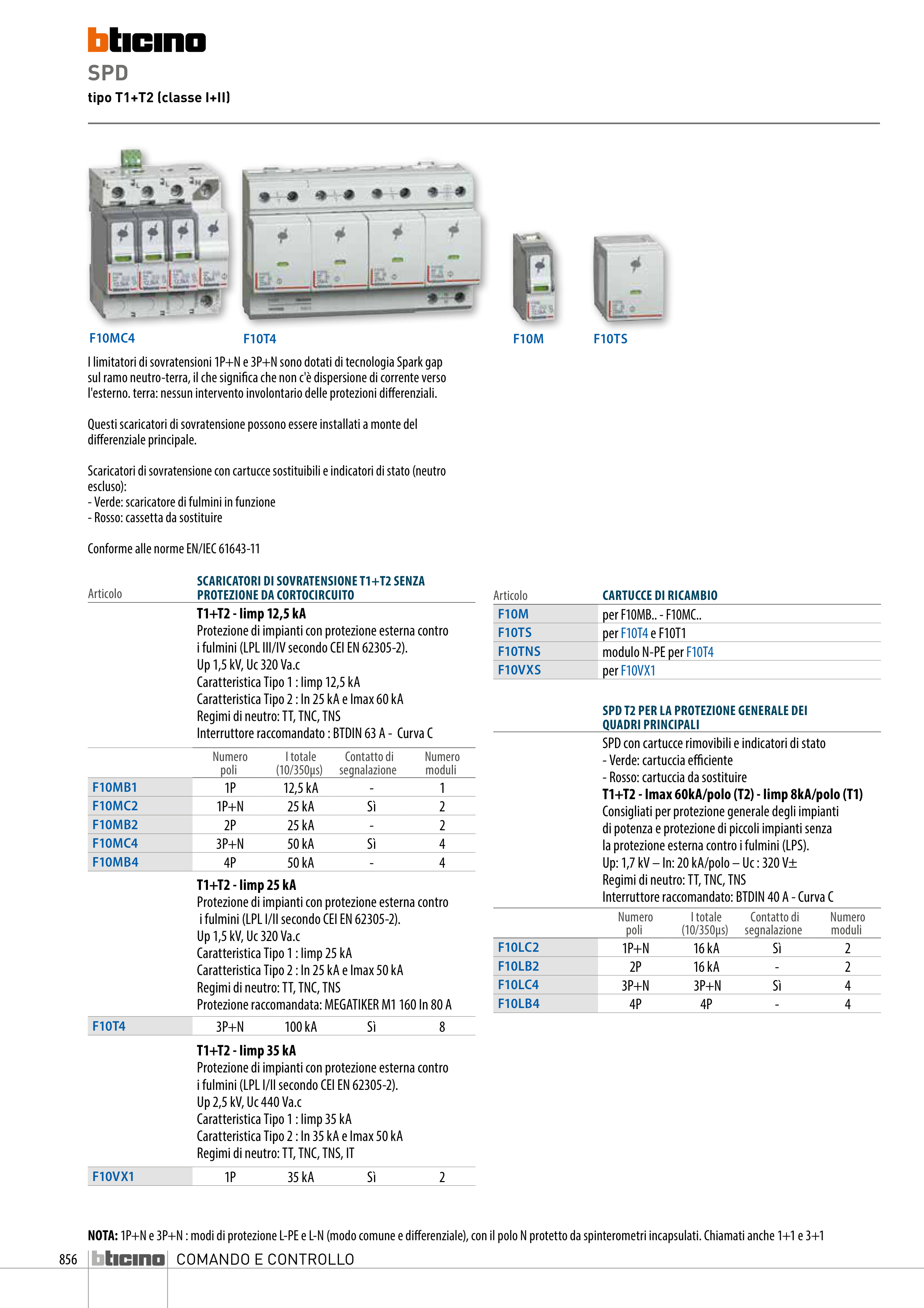 NOTA: 1P+N e 3P+N : modi di protezione L-PE e L-N (modo comune e differenziale), con il polo N protetto da spinterometri incapsulati. Chiamati anche 1+1 e 3+1
