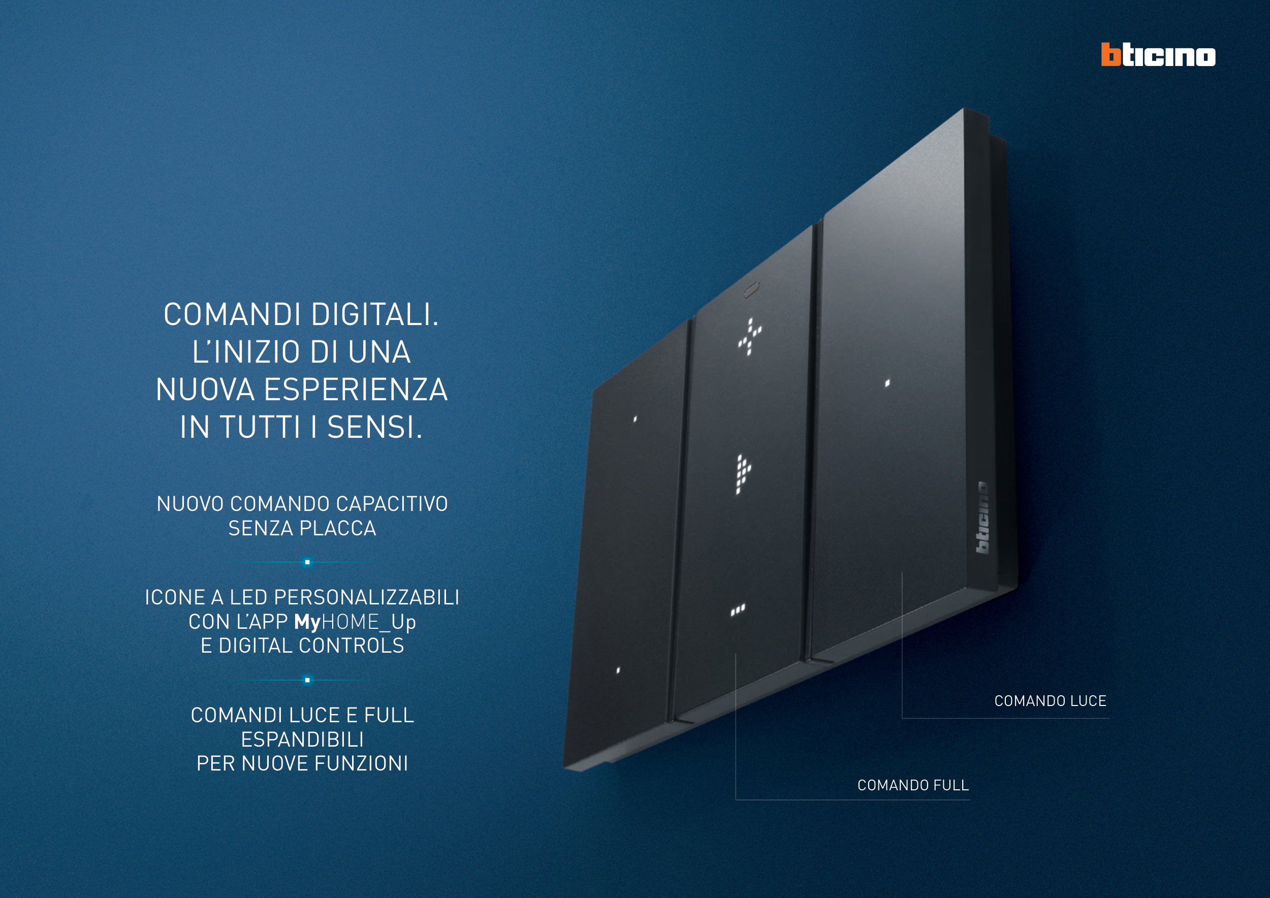 COMANDO FULL COMANDO LUCE COMANDI DIGITALI. L’INIZIO DI UNA NUOVA ESPERIENZA IN TUTTI I SENSI. NUOVO COMANDO CAPACITIVO SENZA PLACCA ICONE A LED PERSONALIZZABILI CON L’APP MyHOME_Up E DIGITAL CONTROLS COMANDI LUCE E FULL ESPANDIBILI PER NUOVE FUNZIONI