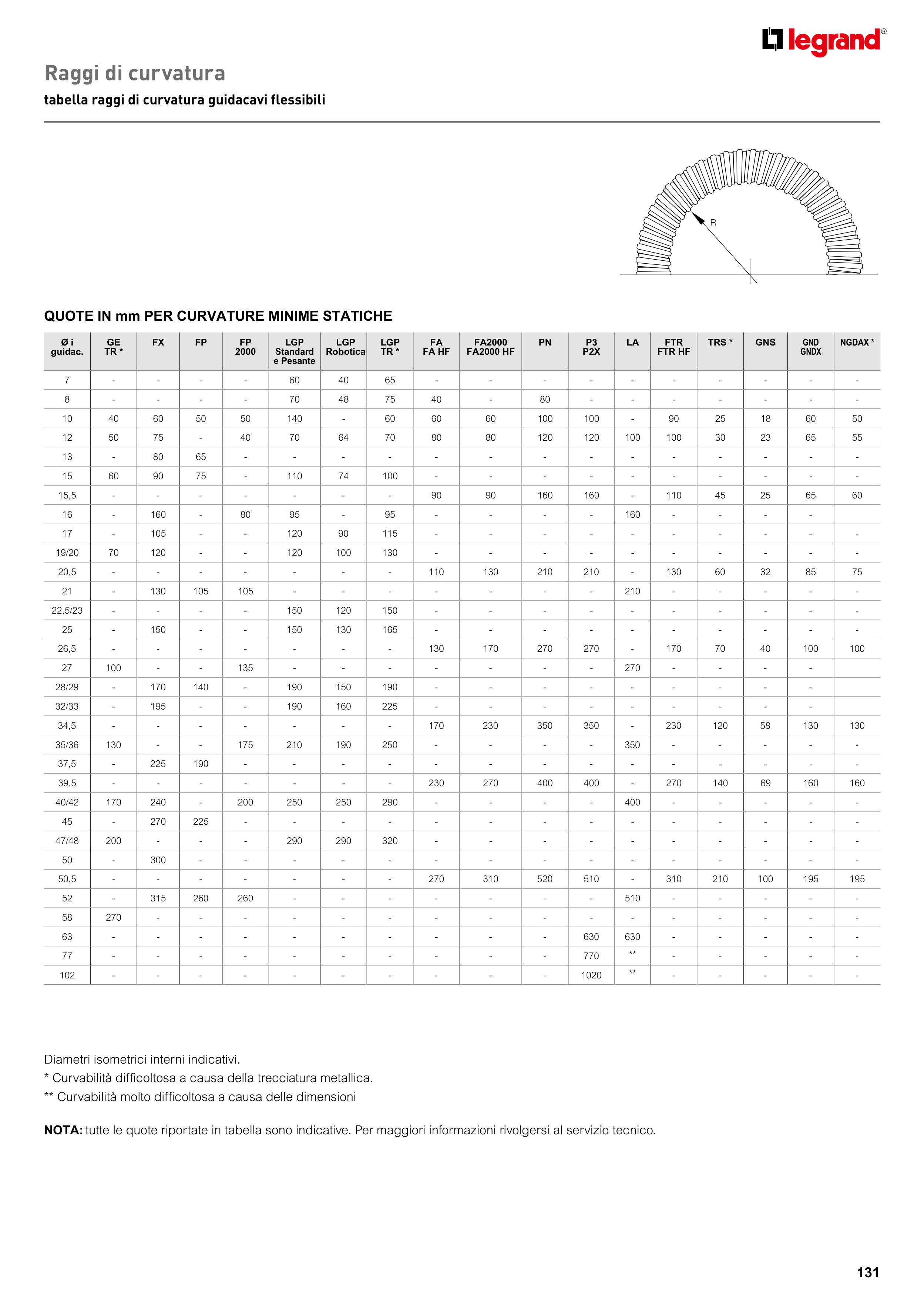 tabella raggi di curvatura guidacavi flessibili