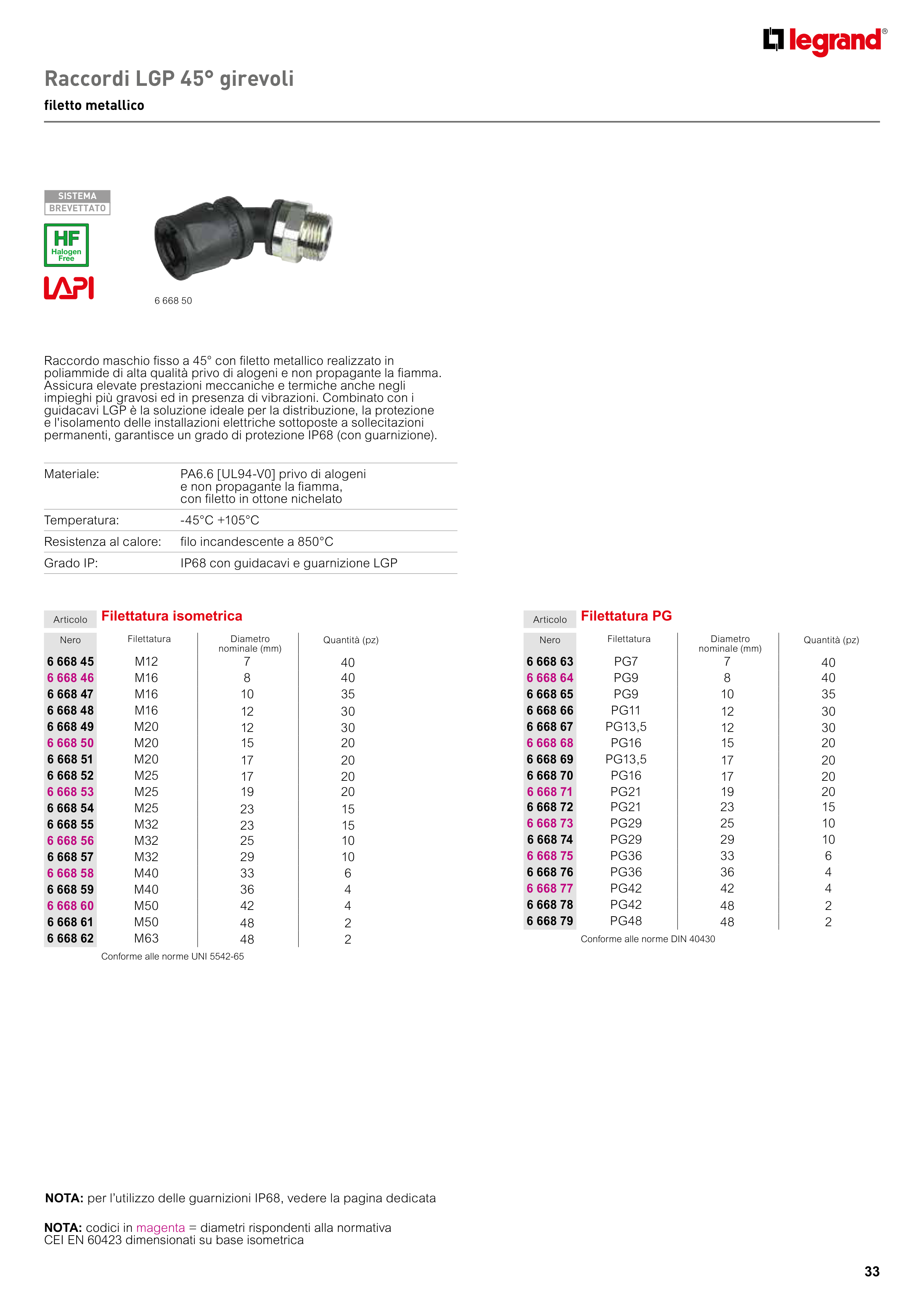 NOTA: codici in magenta = diametri rispondenti alla normativa