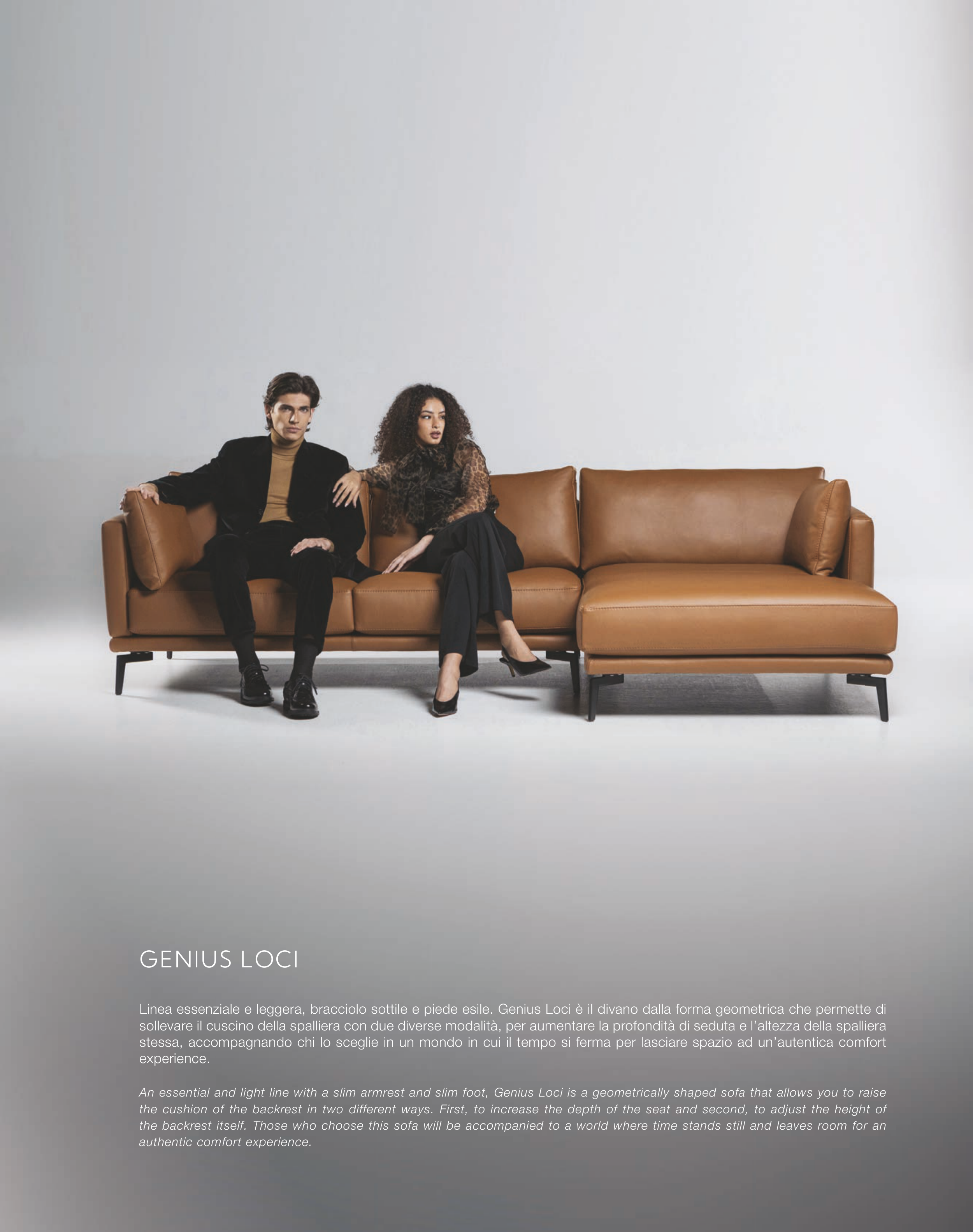 An essential and light line with a slim armrest and slim foot, Genius Loci is a geometrically shaped sofa that allows you to raise
