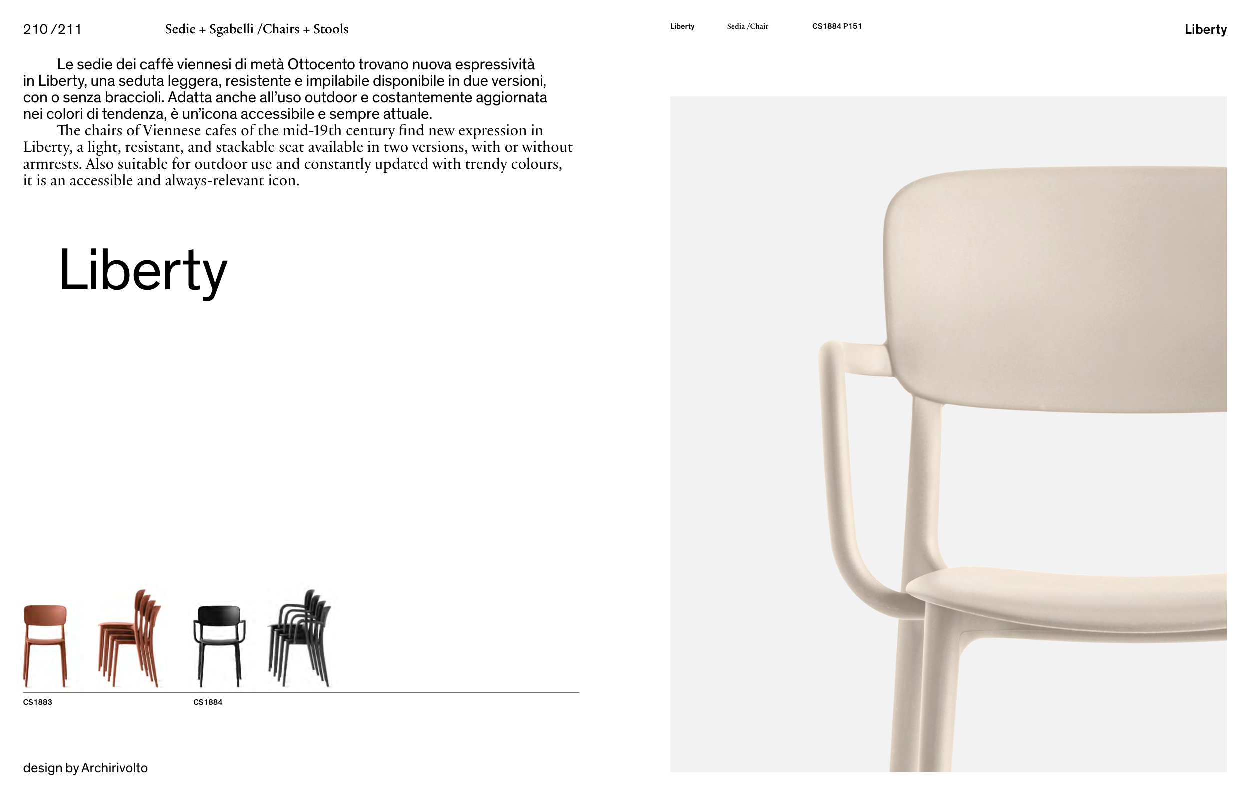 in Liberty, una seduta leggera, resistente e impilabile disponibile in due versioni,