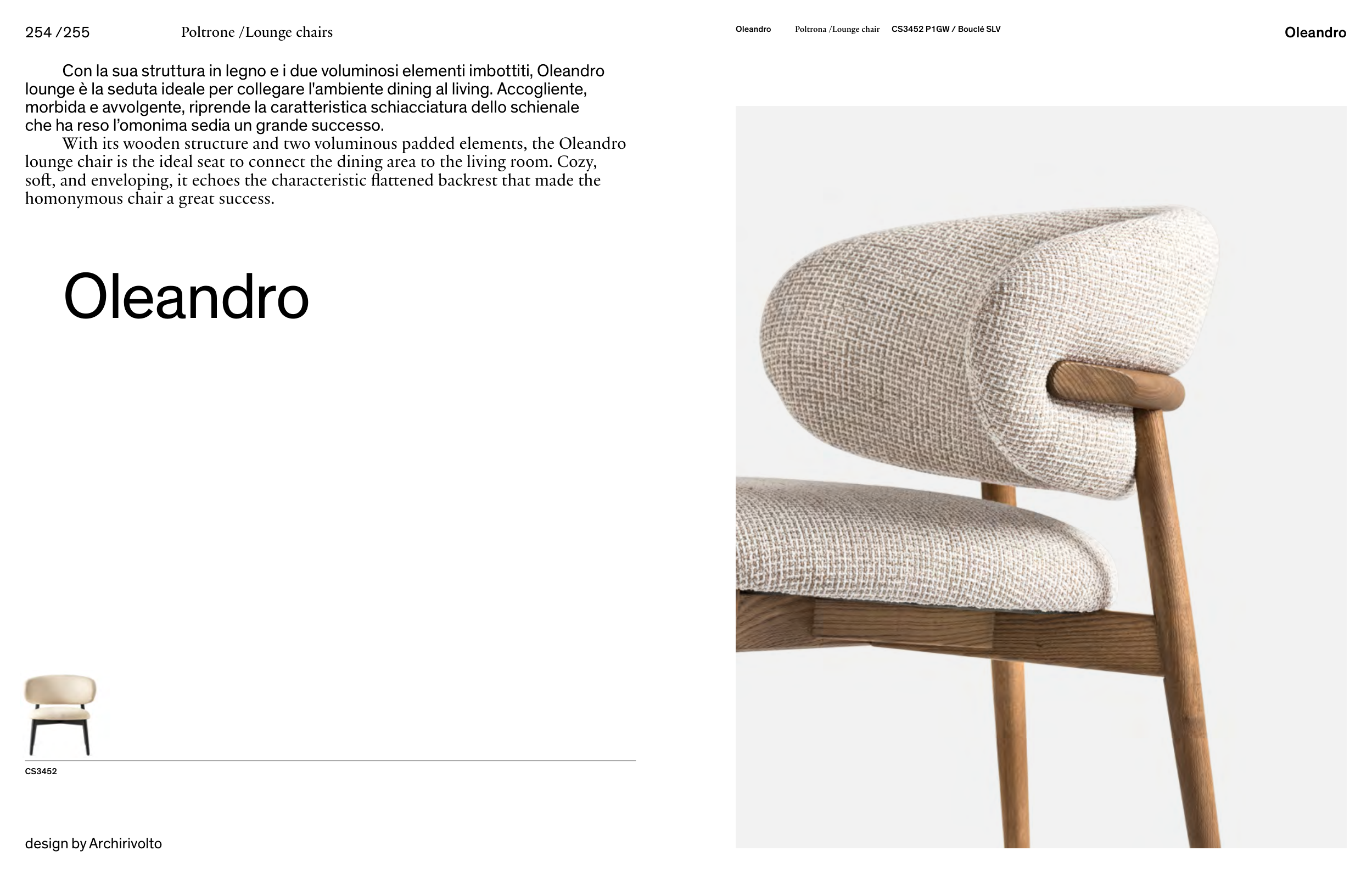 Con la sua struttura in legno e i due voluminosi elementi imbottiti, Oleandro