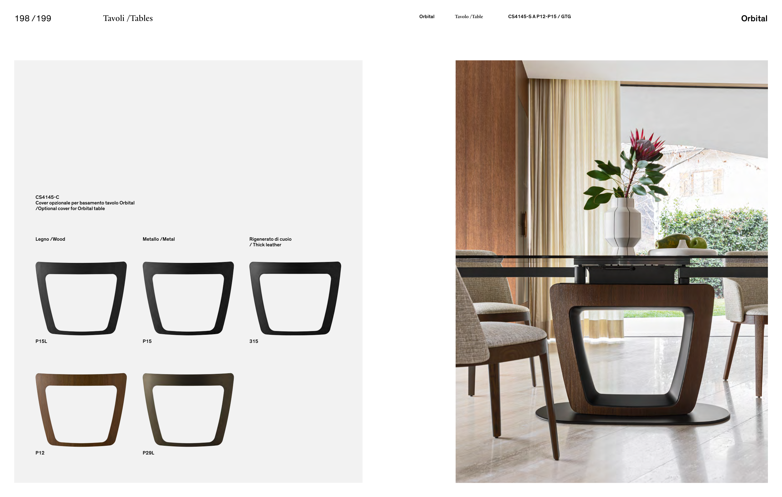 Orbital Tavolo /Table CS4145-S A P12-P15 / GTG P29L P12 CS4145-C Cover opzionale per basamento tavolo Orbital /Optional cover for Orbital table Legno /Wood P15L Metallo /Metal P15 Rigenerato di cuoio / Thick leather 315 Tavoli /Tables Orbital 198 /199