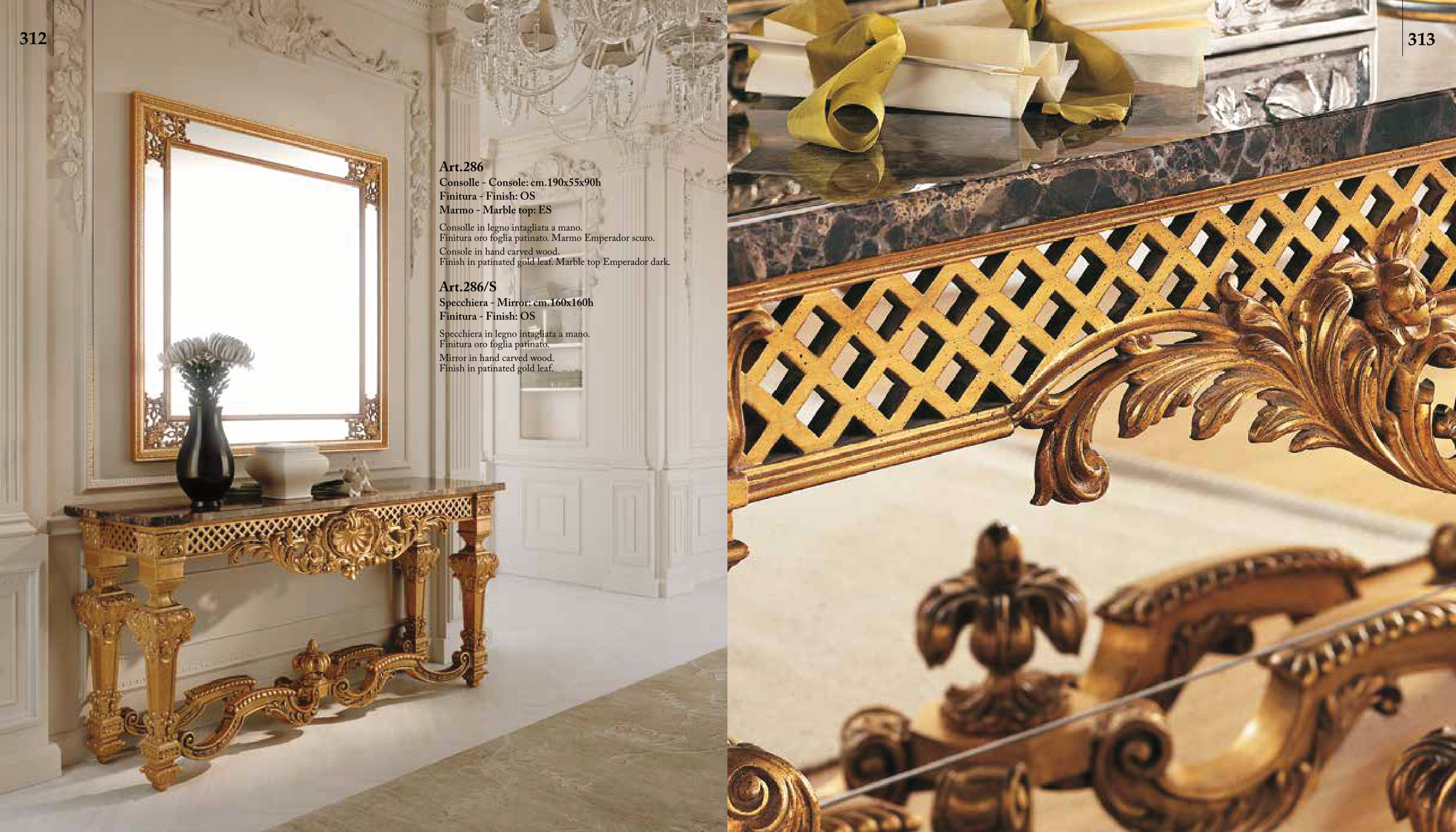 Finitura oro foglia patinato. Marmo Emperador scuro.