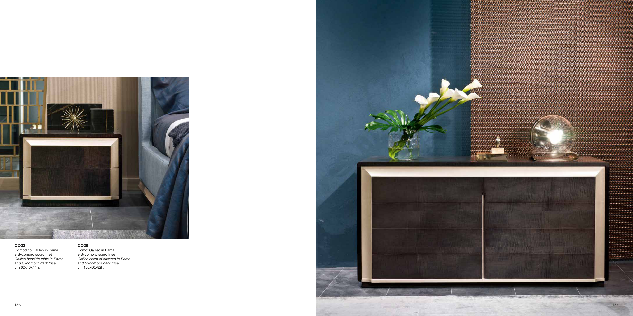 156 CD32 Comodino Galileo in Pama e Sycomoro scuro frisè Galileo bedside table in Pama and Sycomoro dark frisè cm 62x40x44h. CO28 Como’ Galileo in Pama e Sycomoro scuro frisè Galileo chest of drawers in Pama and Sycomoro dark frisè cm 160x50x82h. 157