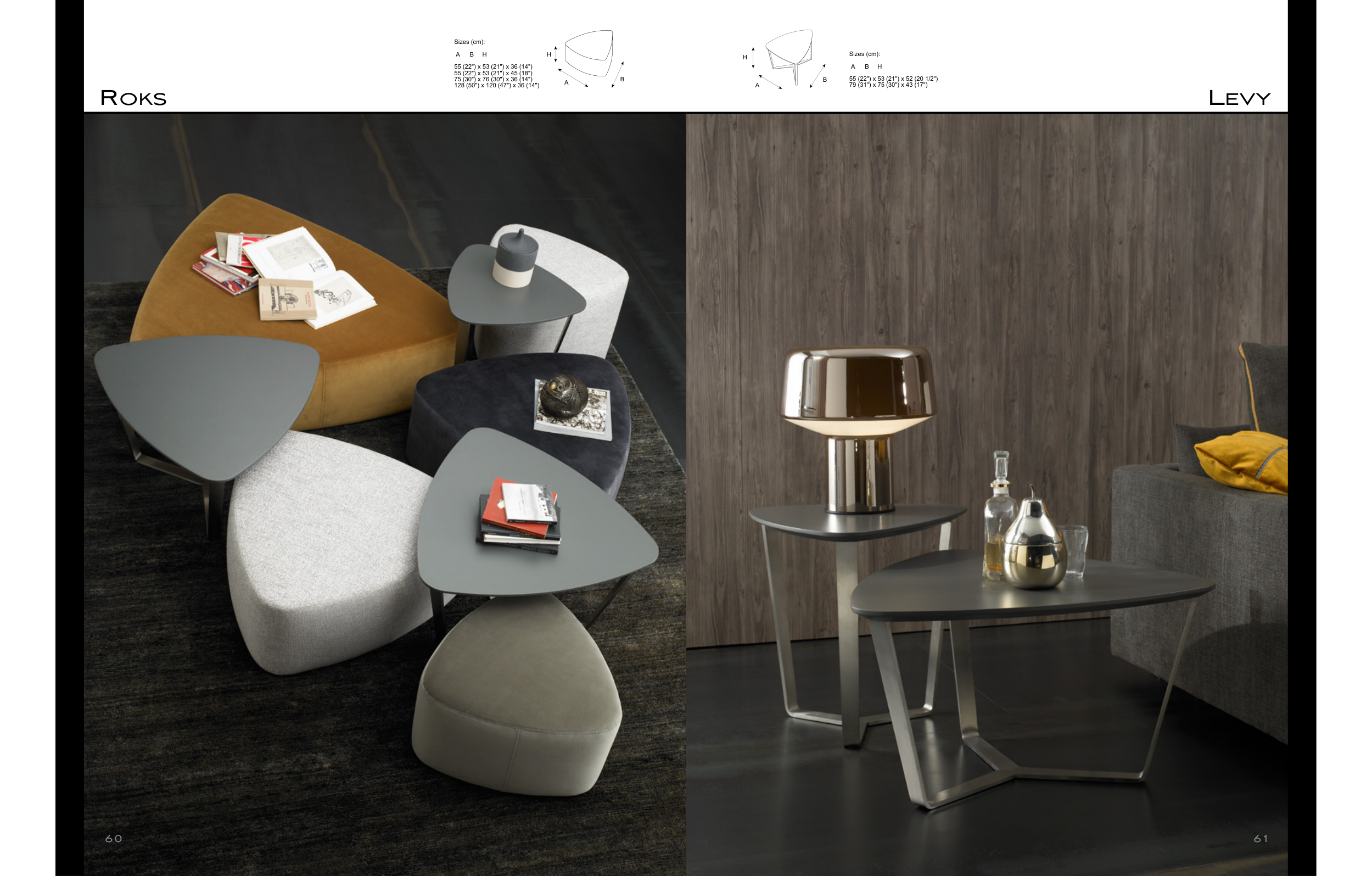 ROKS Sizes (cm): A B H 55 (22") x 53 (21") x 36 (14") 55 (22") x 53 (21") x 45 (18") 75 (30") x 76 (30") x 36 (14") 128 (50") x 120 (47") x 36 (14") A B H B A H Sizes (cm): A B H 55 (22") x 53 (21") x 52 (20 1/2") 79 (31") x 75 (30") x 43 (17") 60 61 LEVY