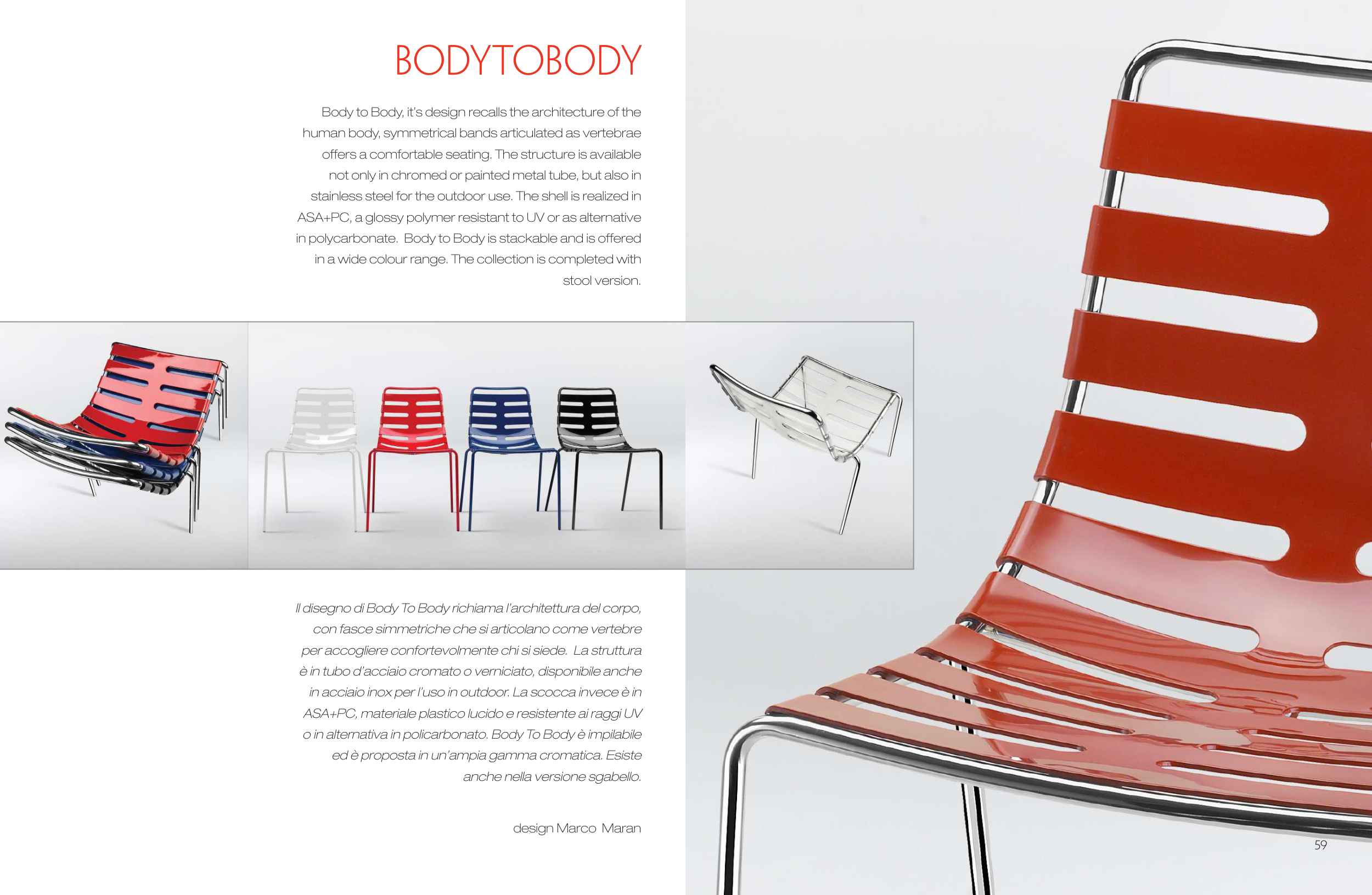 in polycarbonate. Body to Body is stackable and is offered