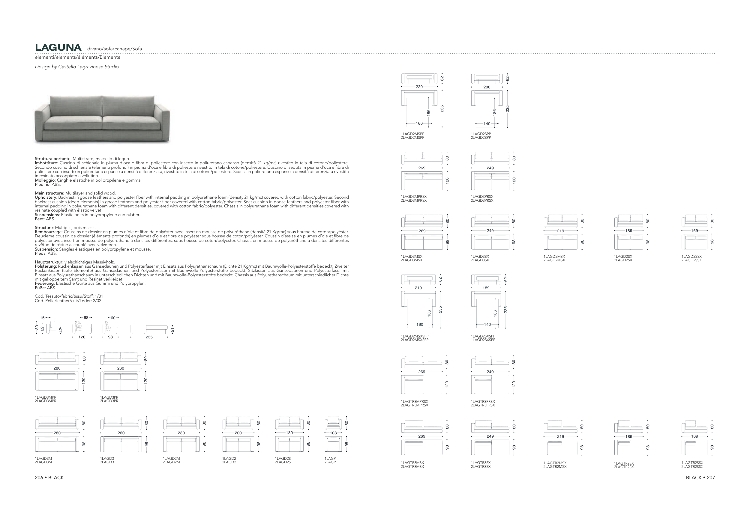 Upholstery: Backrest in goose feathers and polyester fiber with internal padding in polyurethane foam (density 21 kg/mc) covered with cotton fabric/polyester. Second
