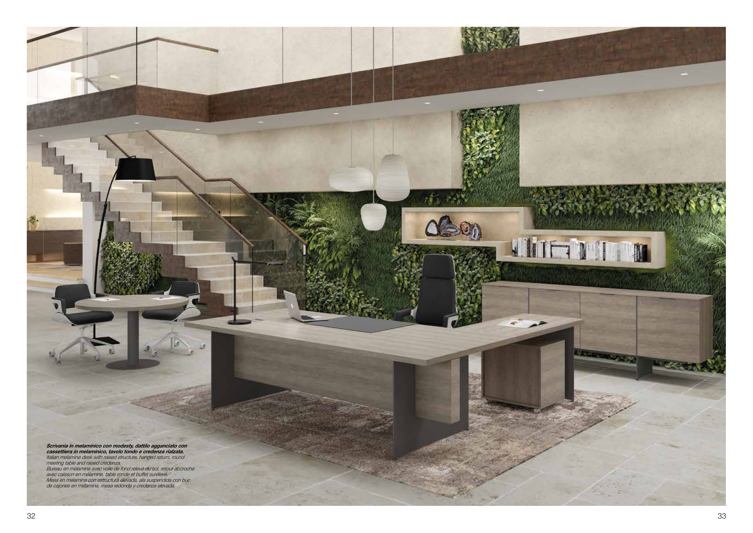 Italian melamine desk with raised structure, hanged return, round