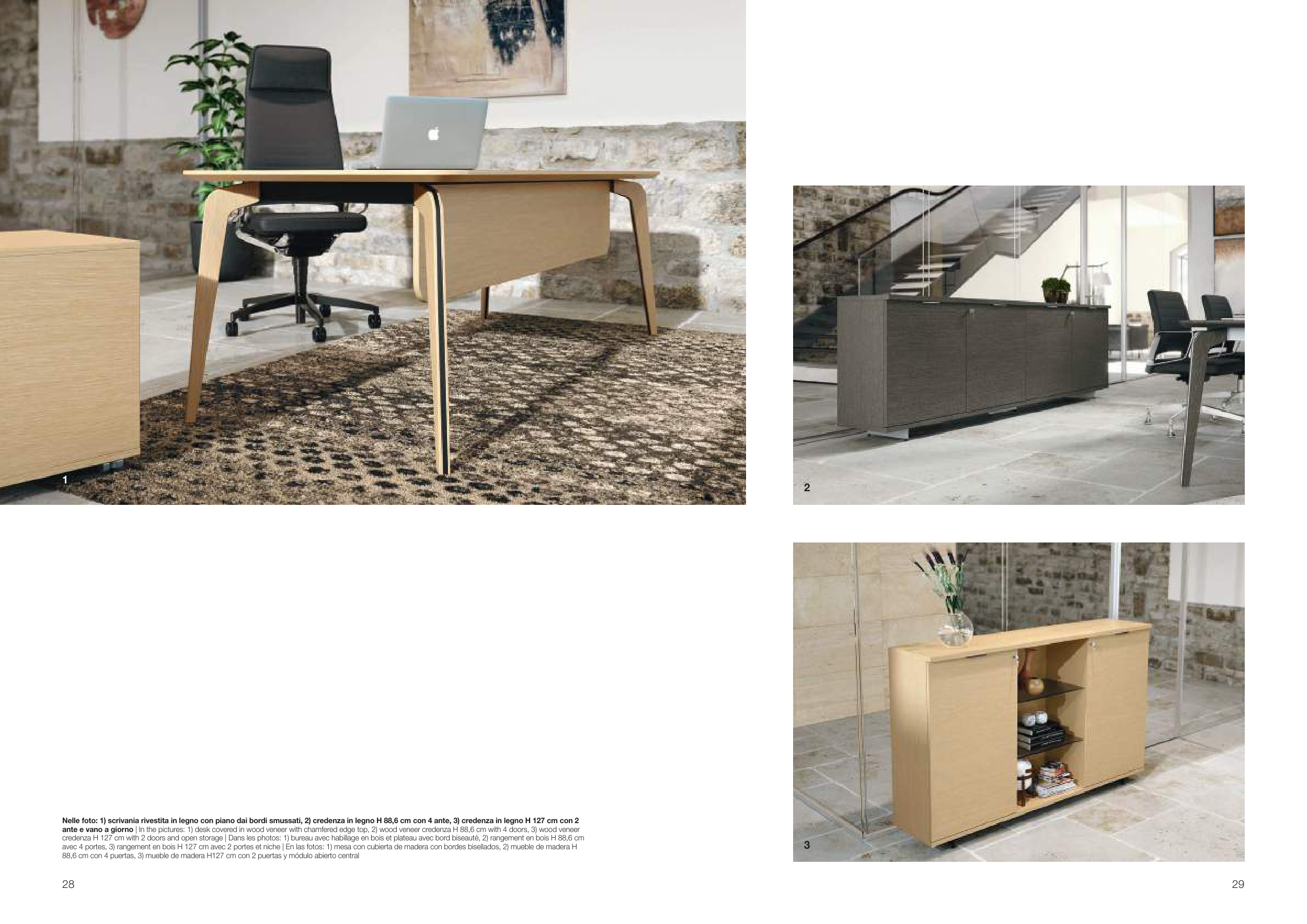 ante e vano a giorno | In the pictures: 1) desk covered in wood veneer with chamfered edge top, 2) wood veneer credenza H 88,6 cm with 4 doors, 3) wood veneer