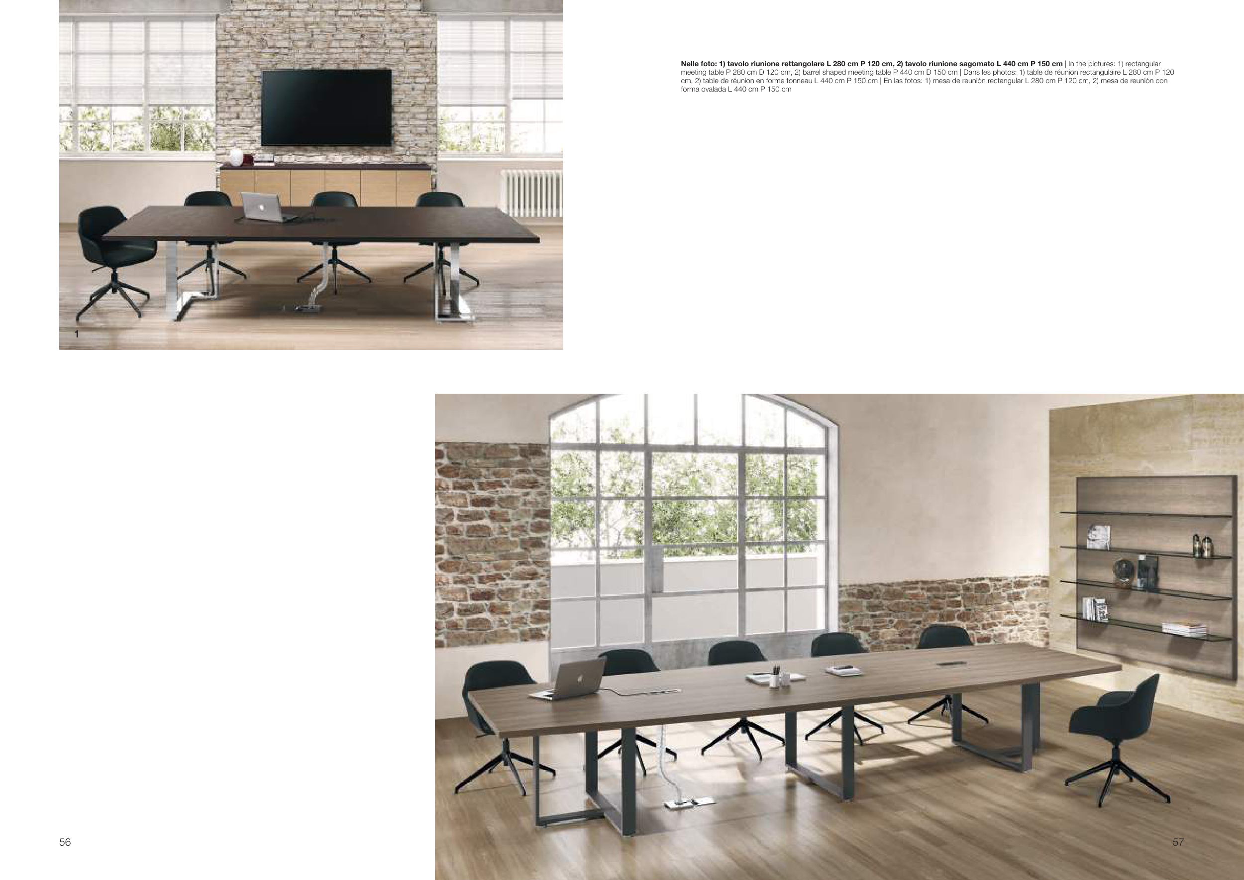 Nelle foto: 1) tavolo riunione rettangolare L 280 cm P 120 cm, 2) tavolo riunione sagomato L 440 cm P 150 cm | In the pictures: 1) rectangular