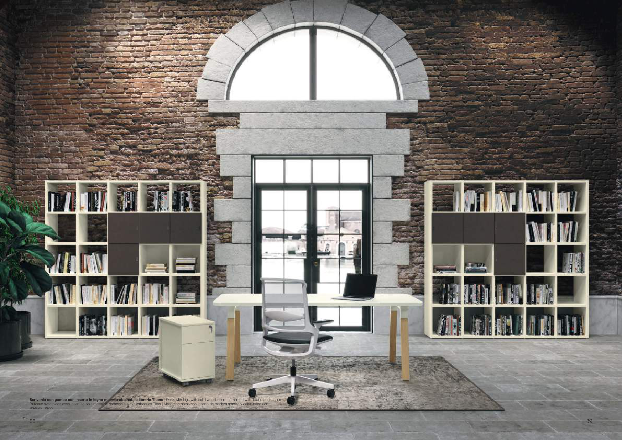 Bureaux avec pieds avec insert en bois massif et combiné aux bibliothèques Titan | Mesa con patas con inserto de madera maciza y combinado con