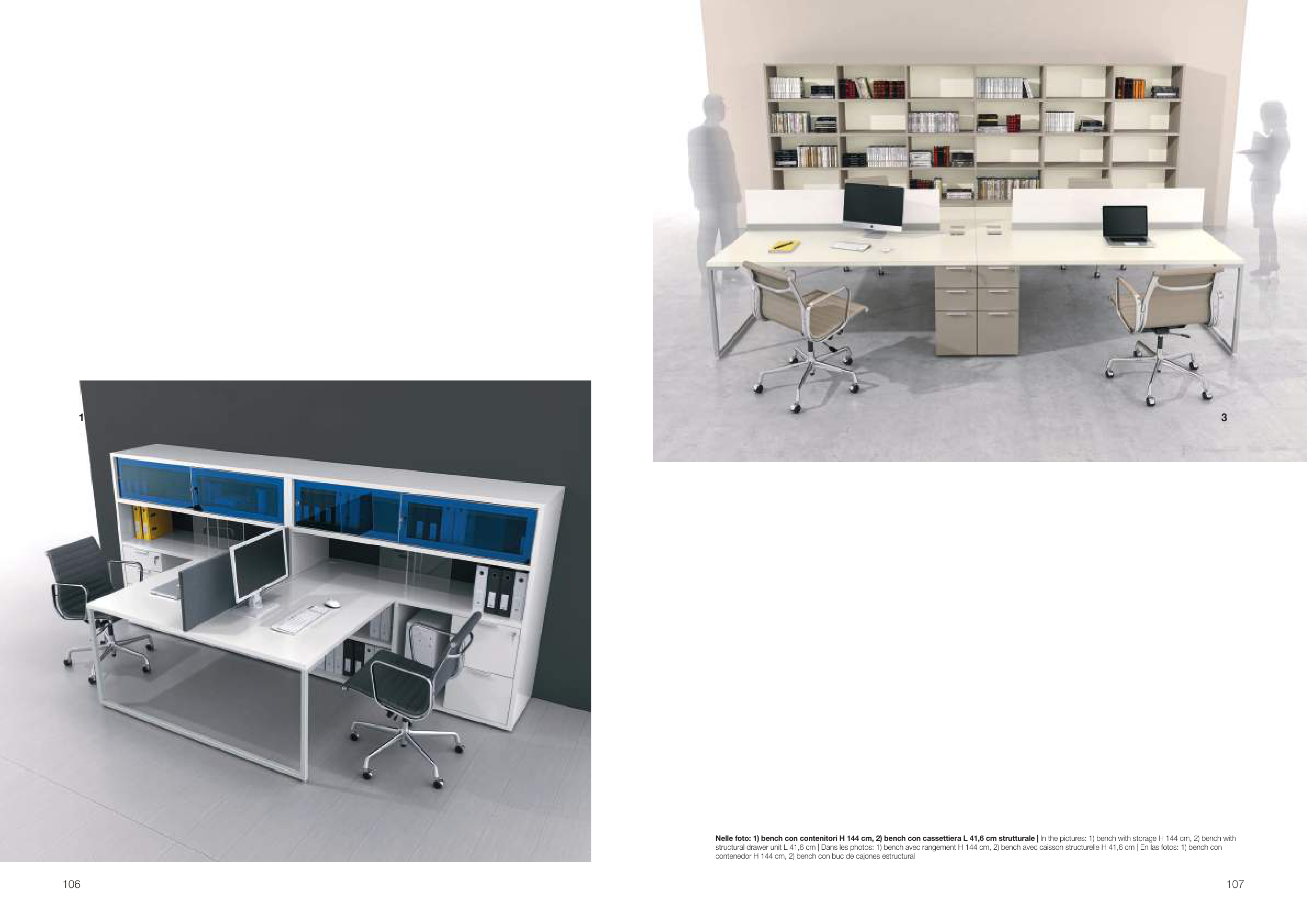 Nelle foto: 1) bench con contenitori H 144 cm, 2) bench con cassettiera L 41,6 cm strutturale | In the pictures: 1) bench with storage H 144 cm, 2) bench with