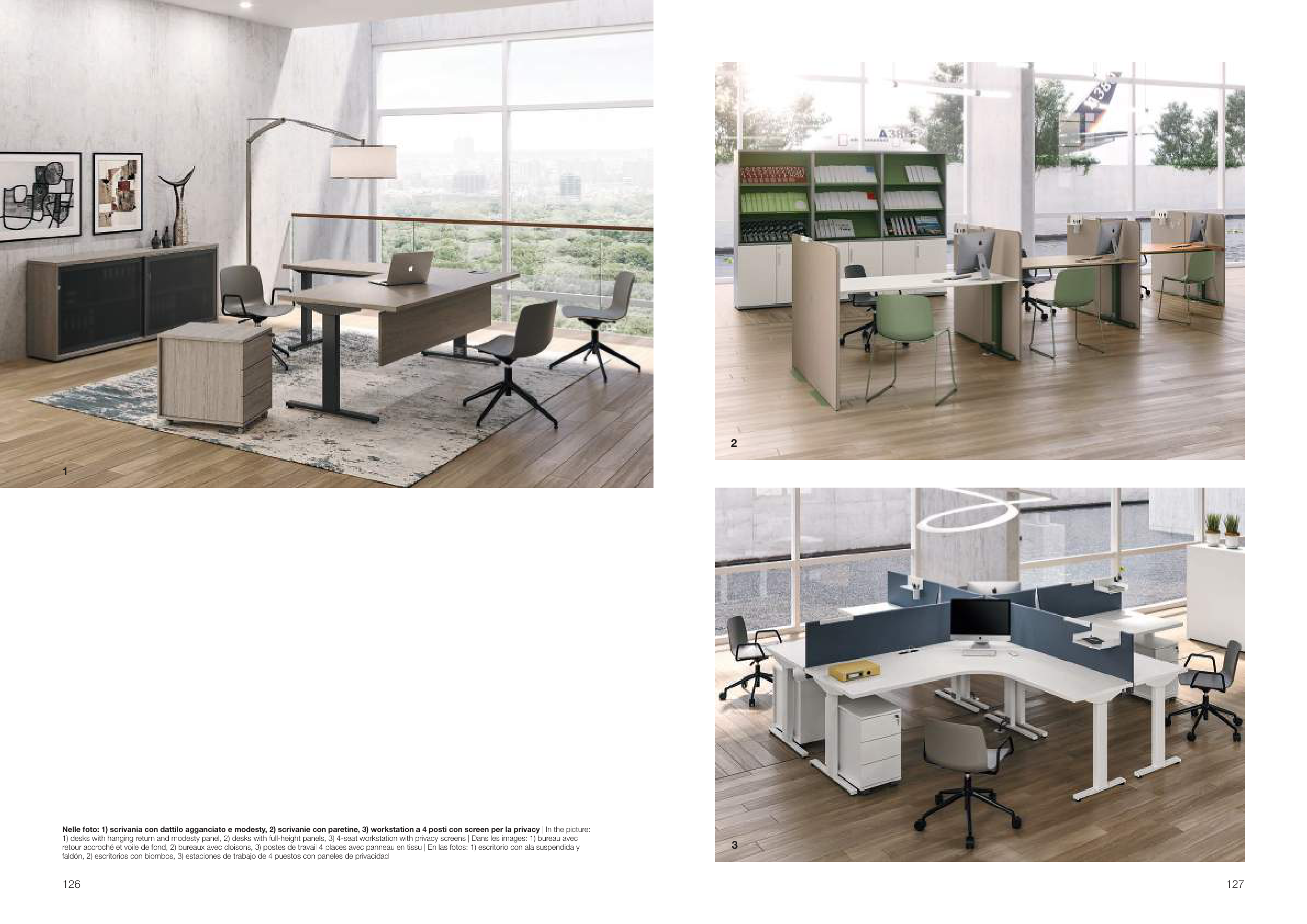 Nelle foto: 1) scrivania con dattilo agganciato e modesty, 2) scrivanie con paretine, 3) workstation a 4 posti con screen per la privacy | In the picture: