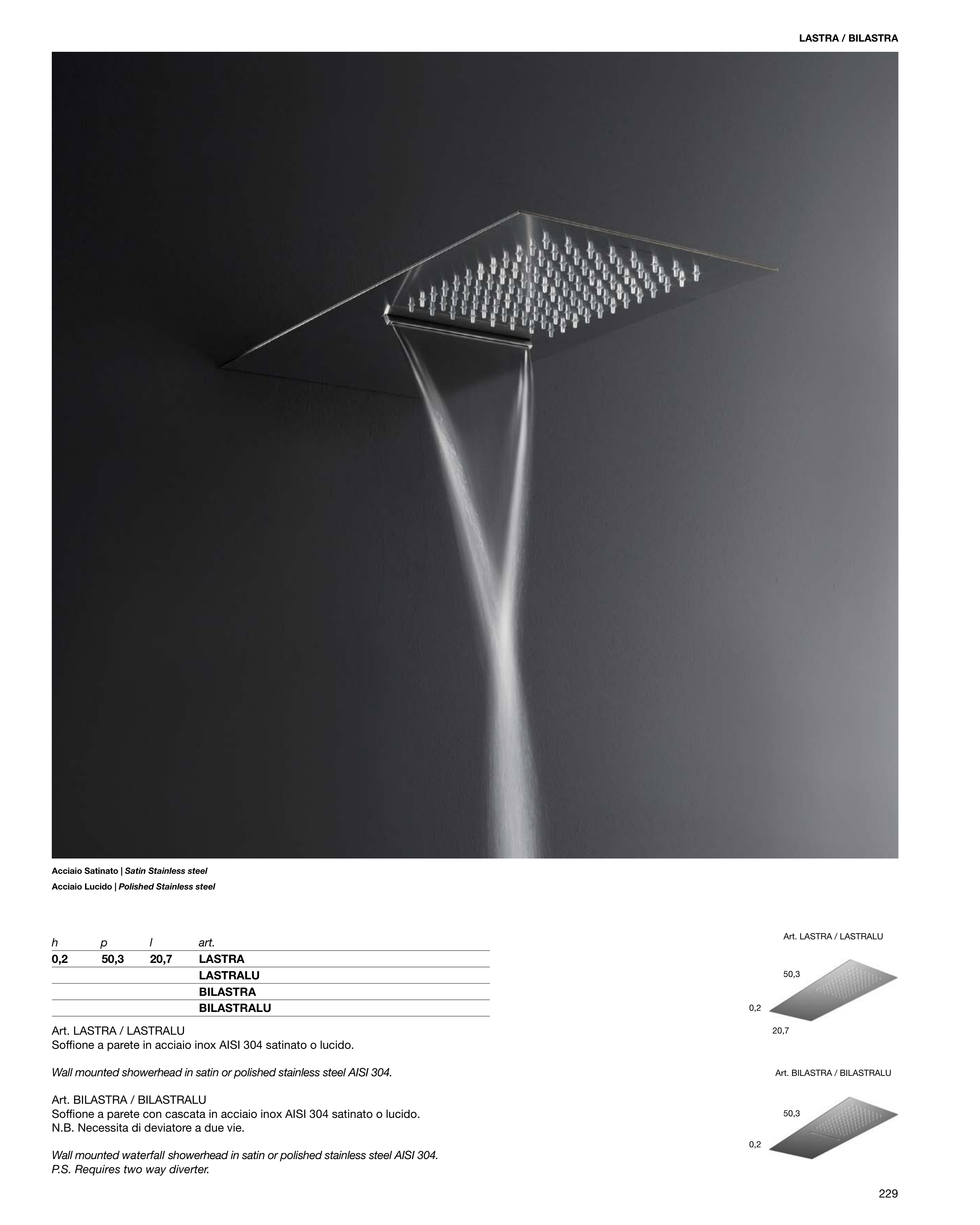 Soffione a parete con cascata in acciaio inox AISI 304 satinato o lucido.