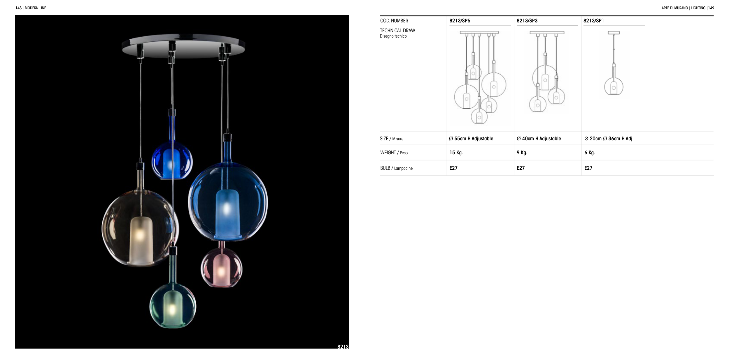 148 COD. NUMBER 8213/SP5 8213/SP3 8213/SP1 15 Kg. 9 Kg. 6 Kg. TECHNICAL DRAW Disegno techico WEIGHT / Peso BULB / Lampadine SIZE / Misure | MODERN LINE E27 E27 E27 Ø 55cm H Adjustable Ø 40cm H Adjustable Ø 20cm Ø 36cm H Adj ARTE DI MURANO | LIGHTING |149 148 8213