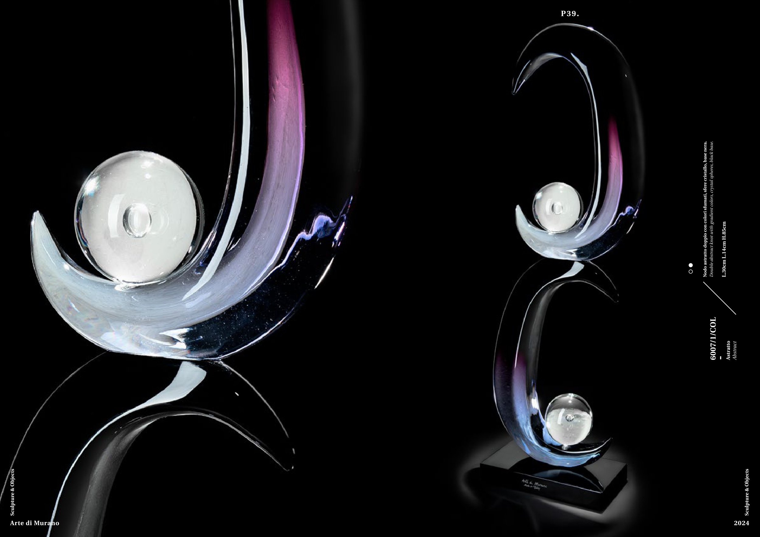 Nodo astratto doppio con colori sfumati, sfere cristallo, base nera.