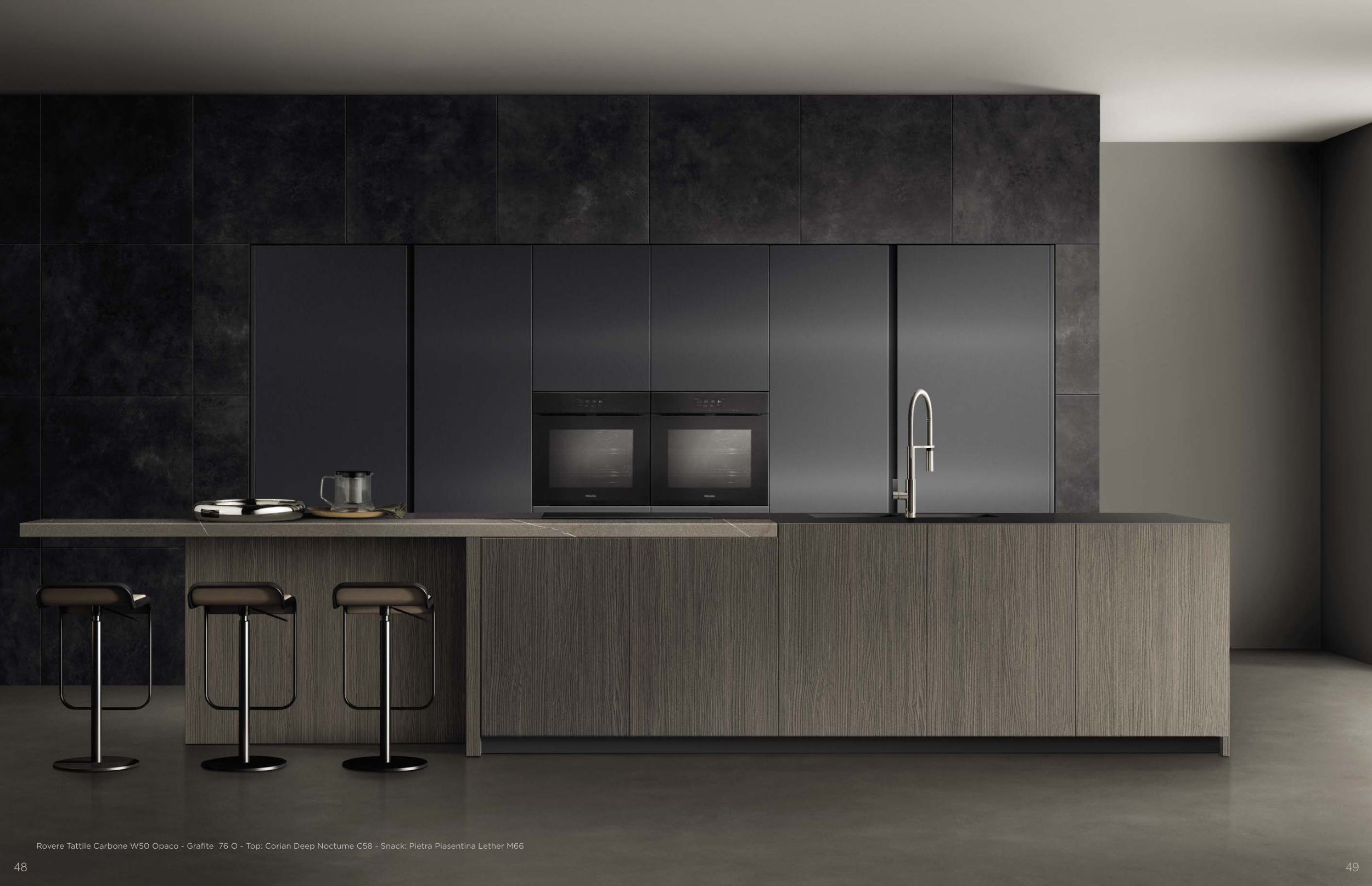 Rovere Tattile Carbone W50 Opaco - Grafite 76 O - Top: Corian Deep Noctume C58 - Snack: Pietra Piasentina Lether M66