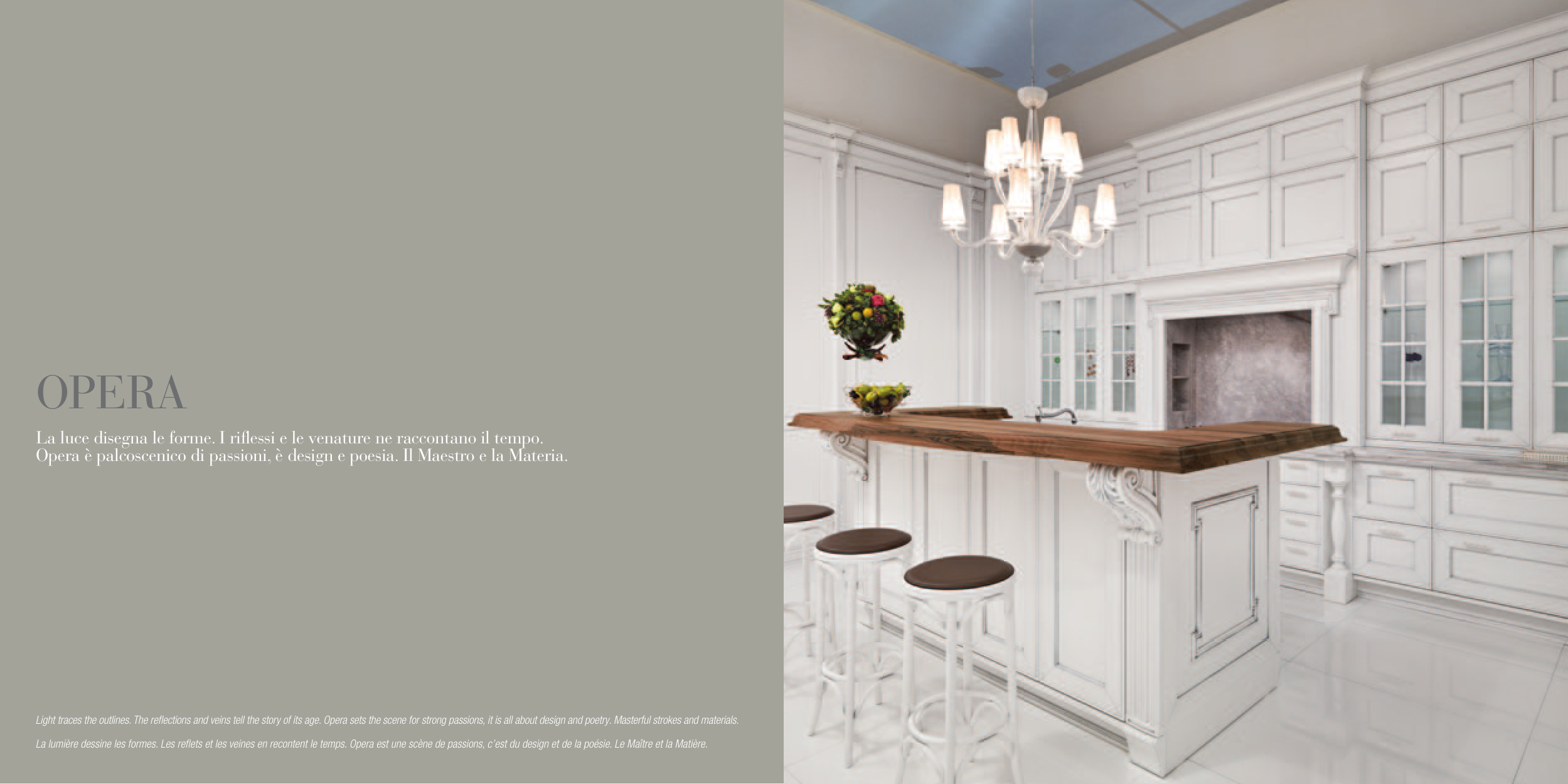 Light traces the outlines. The reflections and veins tell the story of its age. Opera sets the scene for strong passions, it is all about design and poetry. Masterful strokes and materials.