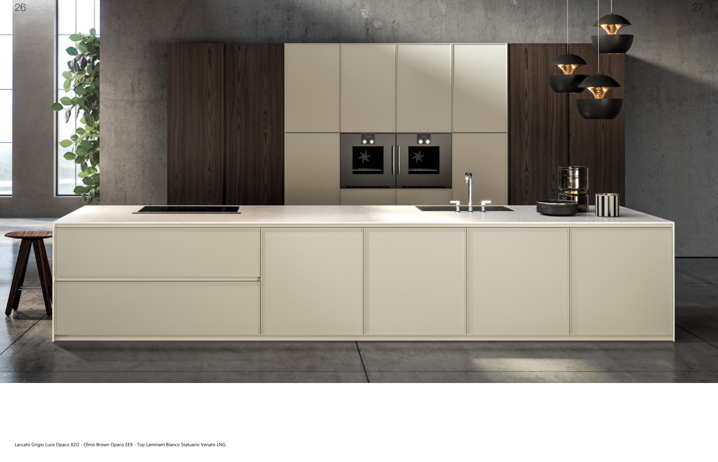 Laccato Grigio Luce Opaco 82O - Olmo Brown Opaco EE9 - Top Laminam Bianco Statuario Venato LNG