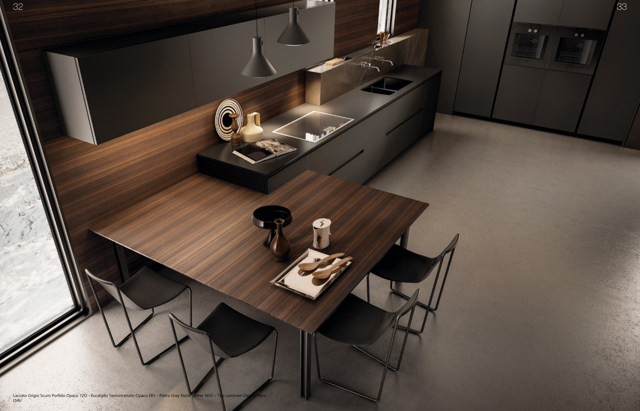 Laccato Grigio Scuro Porfido Opaco 72O - Eucalipto Termotrattato Opaco EB1 - Pietra Grey Stone Lether M52 – Top Laminam Ossido Nero